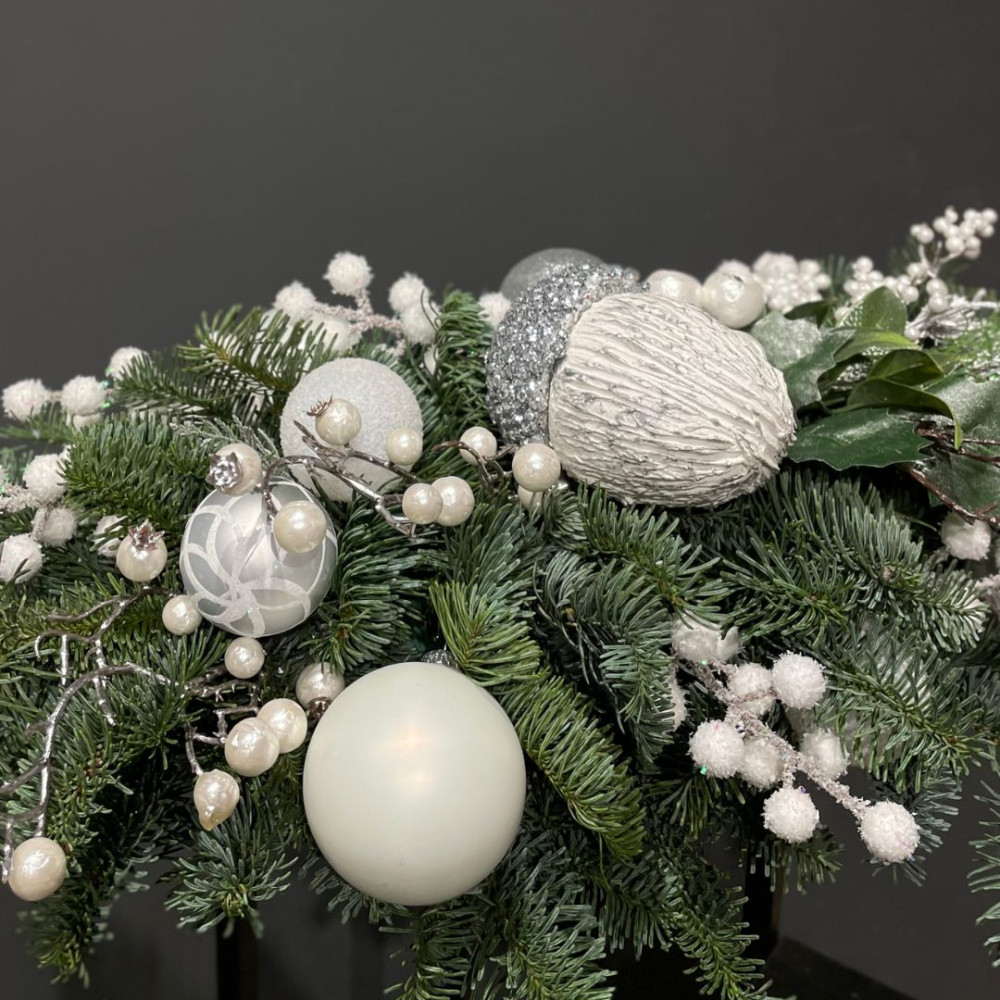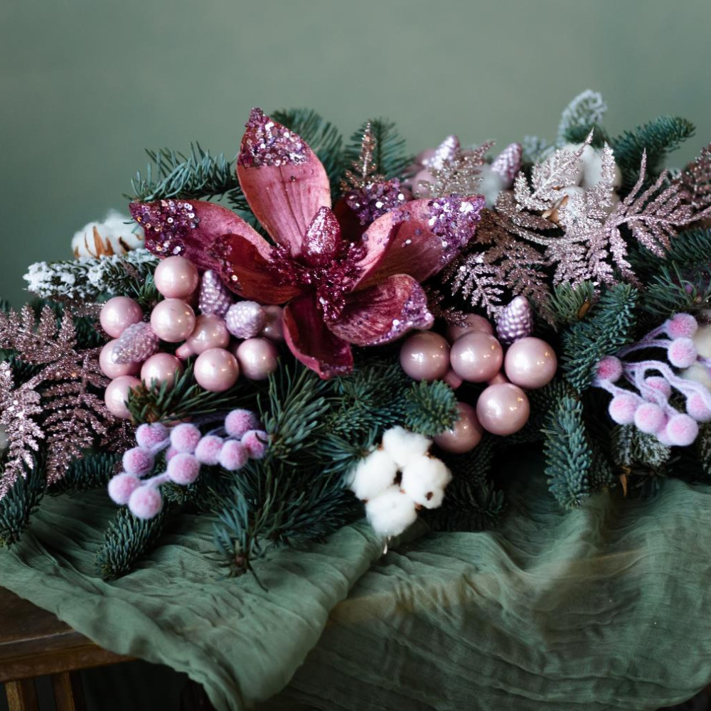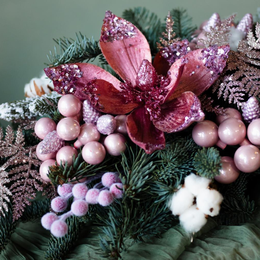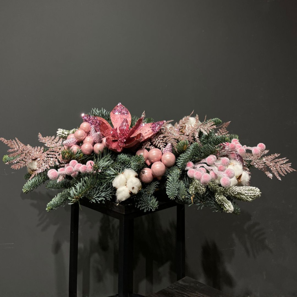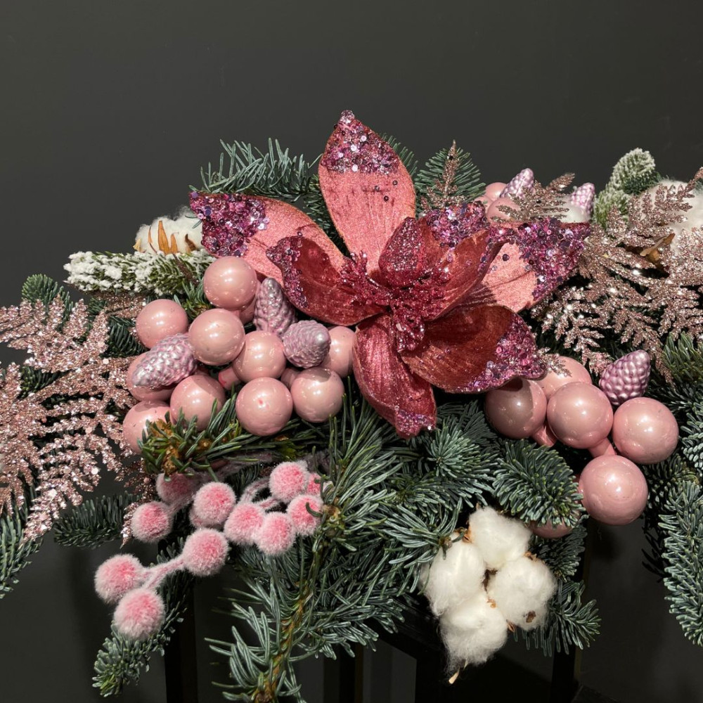 Нобилис, декоративные цветы и ветки, стеклянные елочные игрушки. Цветовая гамма подбирается по согласованию с заказчиком, перед отправкой мы при необходимости направляем фото готовой работы.
