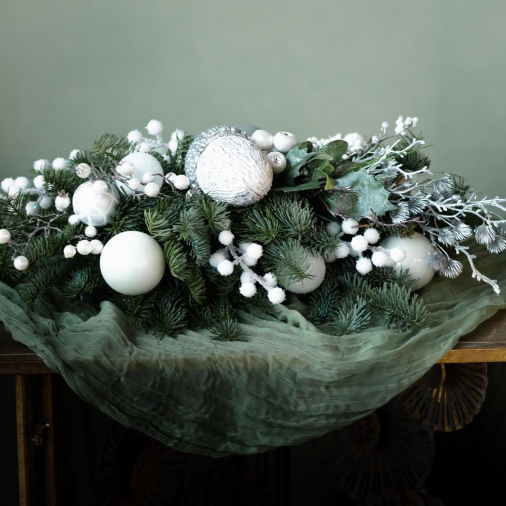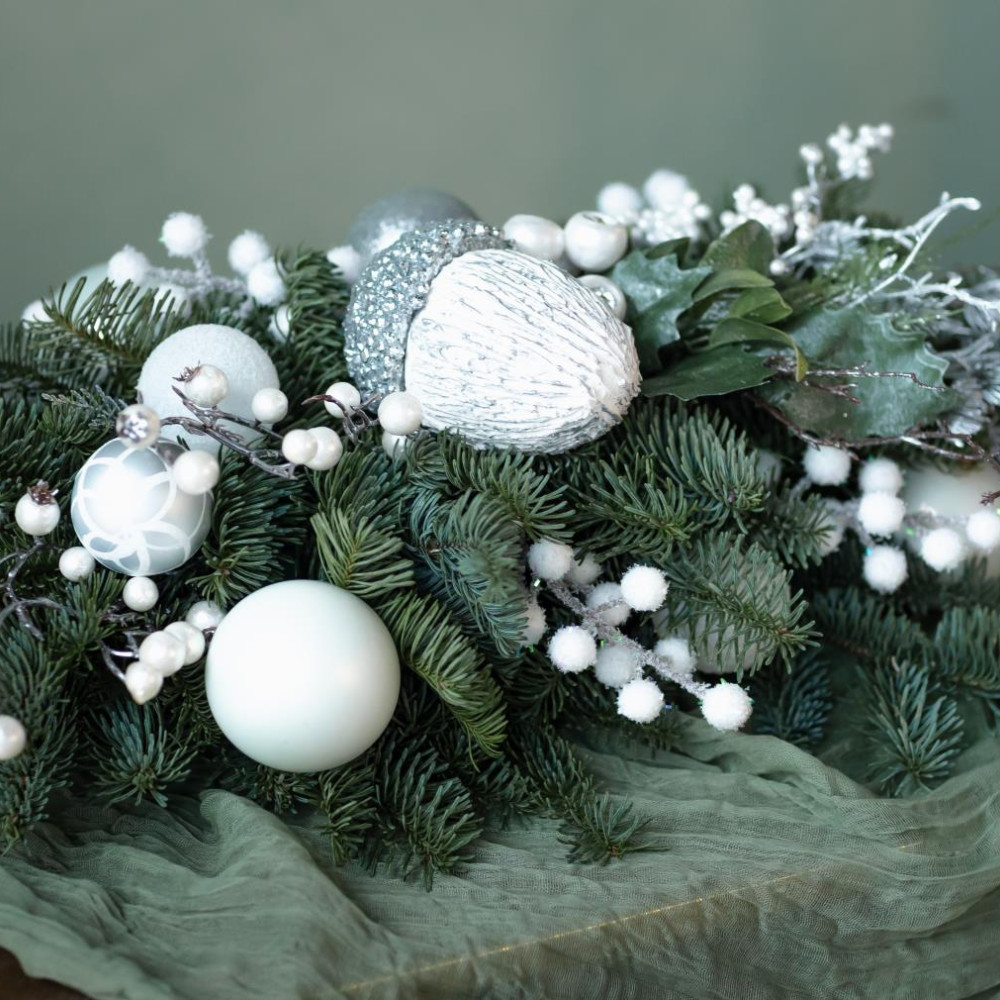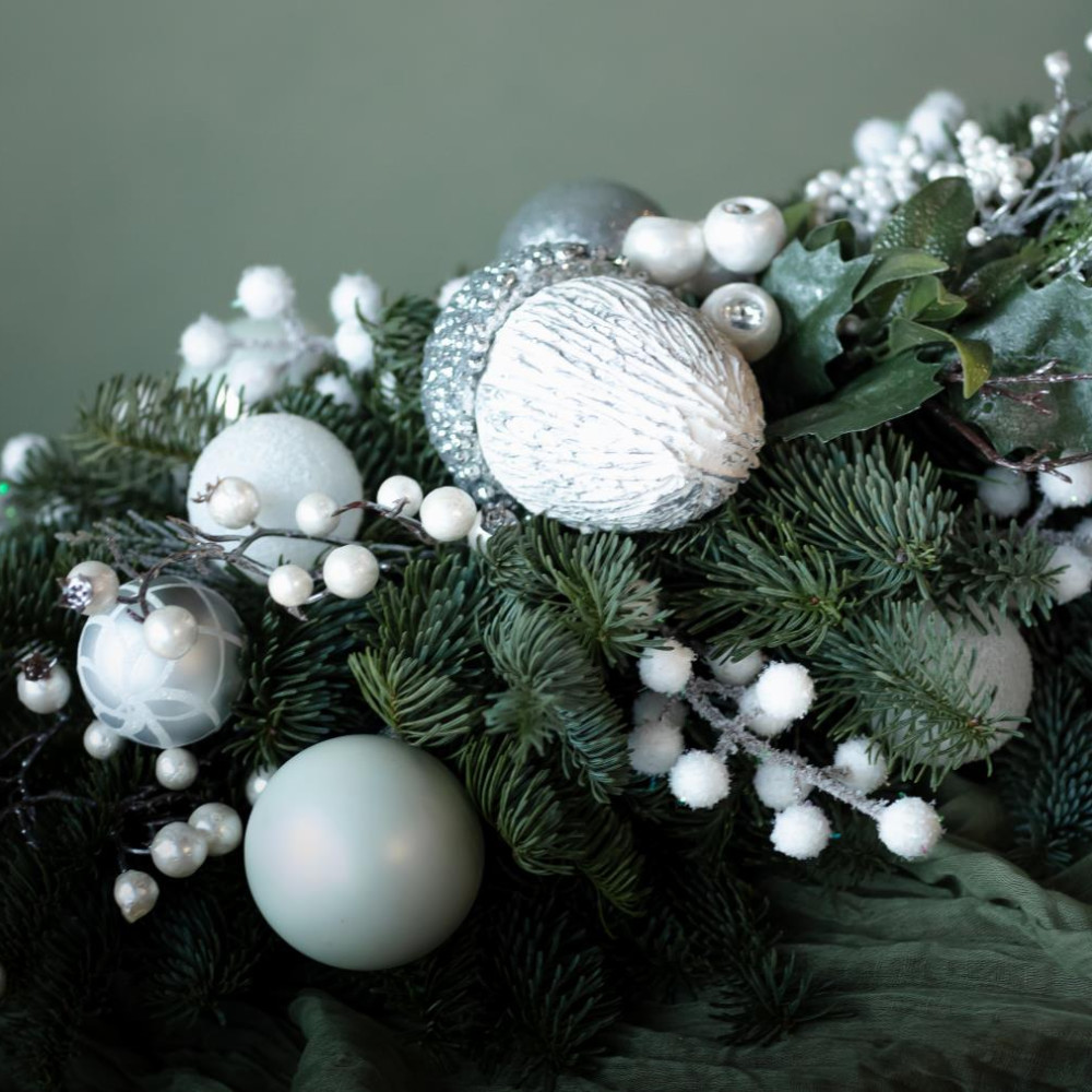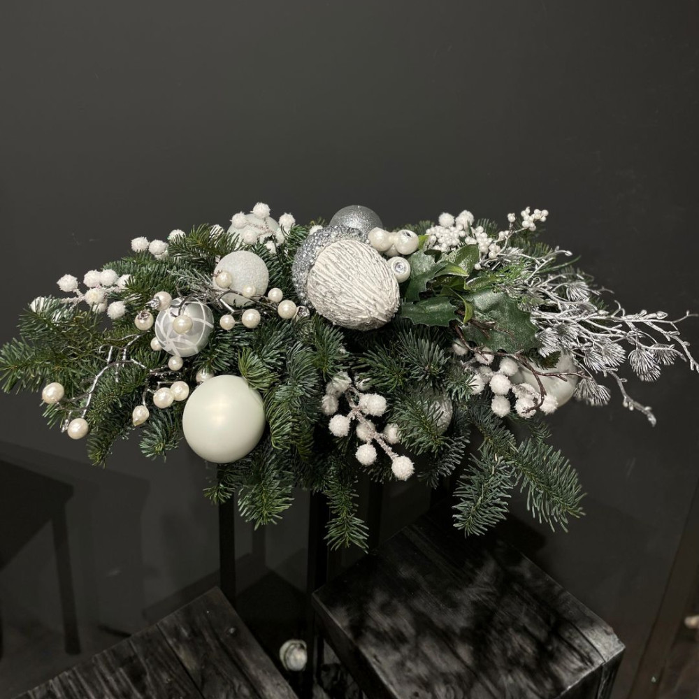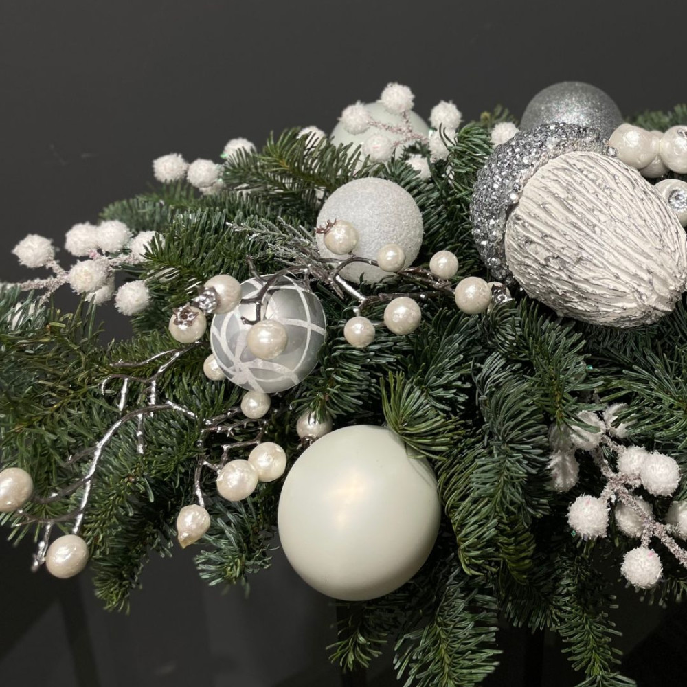 Нобилис, декоративные цветы и ветки, стеклянные елочные игрушки. Цветовая гамма подбирается по согласованию с заказчиком, перед отправкой мы при необходимости направляем фото готовой работы.