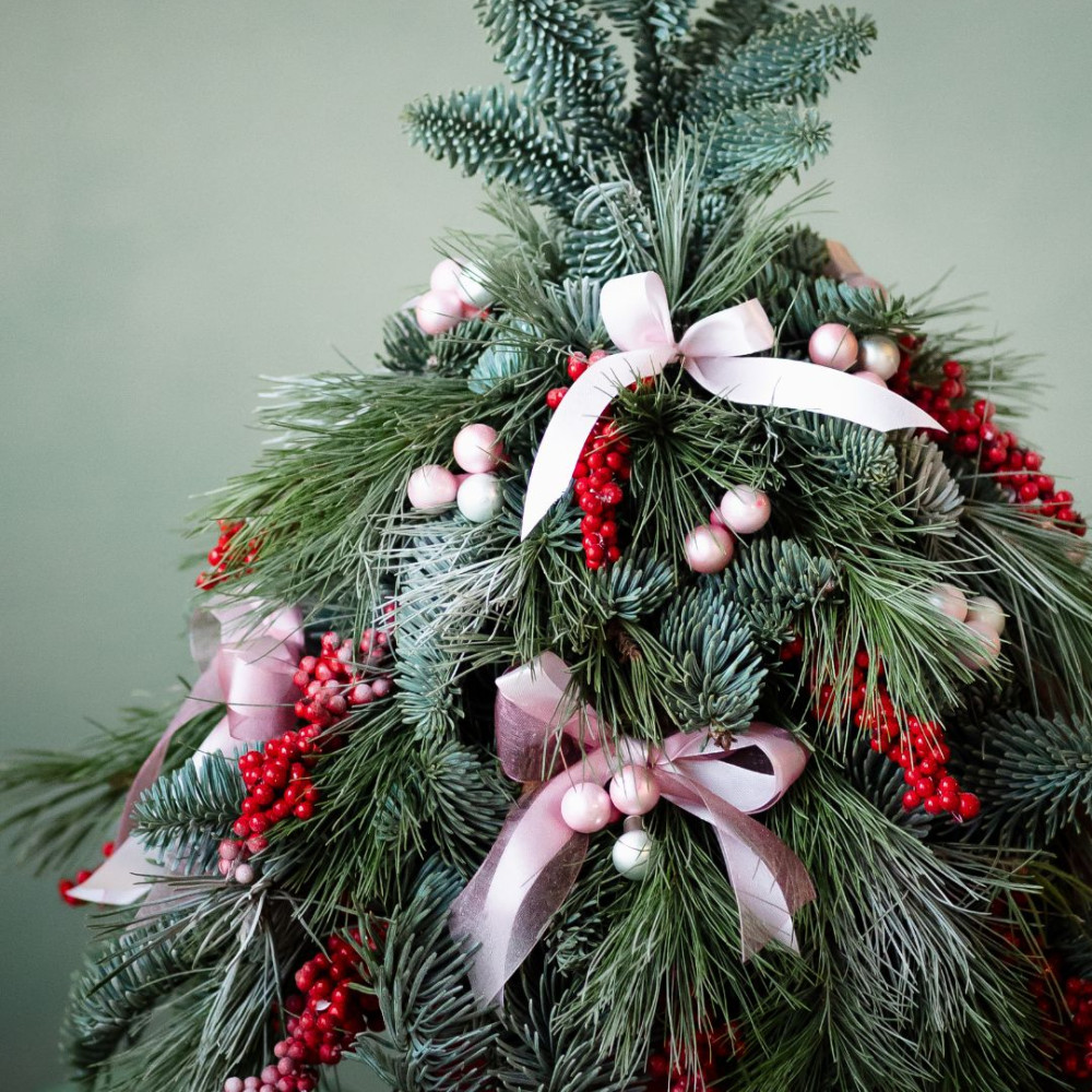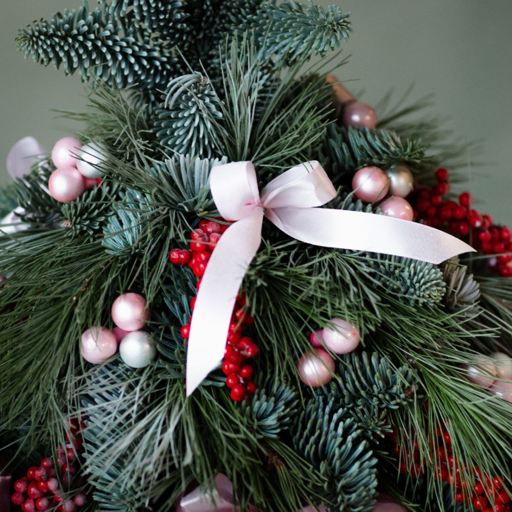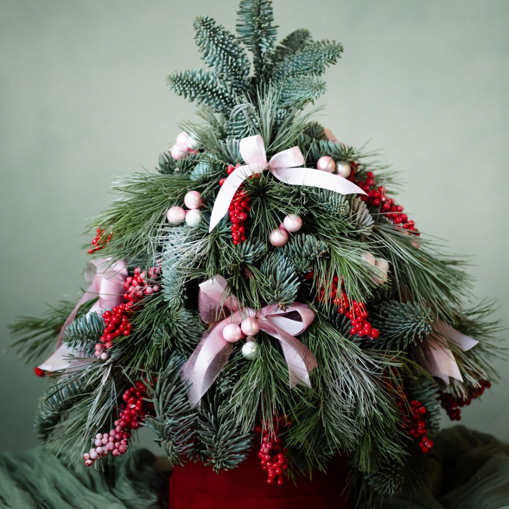 Небольшая стилизованная ёлочка, собранная из ароматного нобилиса и сосны, оформлена в бархатной шляпной коробке. Живые хвойные ветви создают ощущение настоящего зимнего леса, а стеклянные ёлочные шарики и изящные банты добавляют праздничный блеск и утончённость.