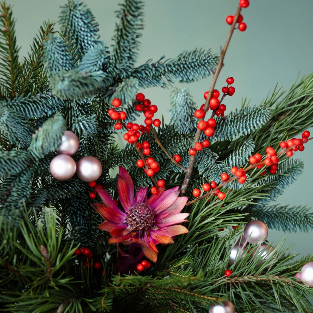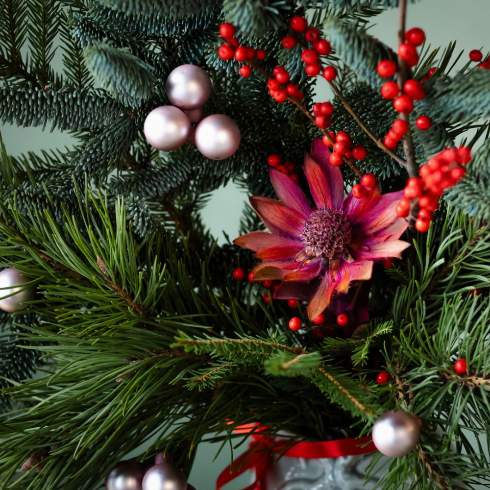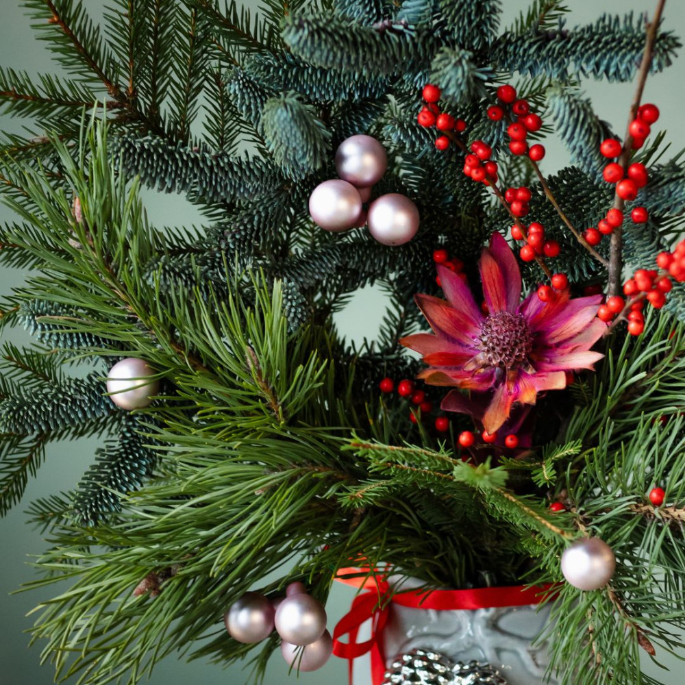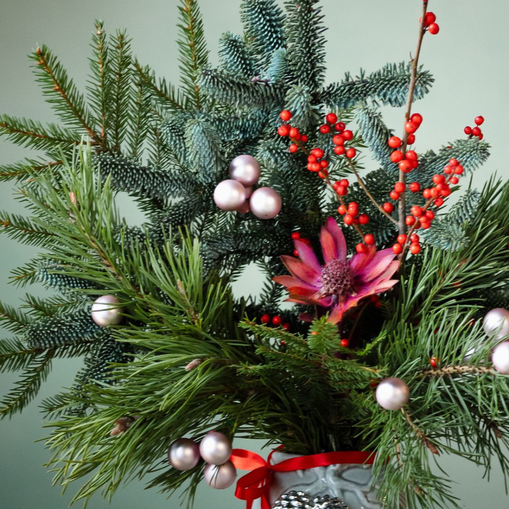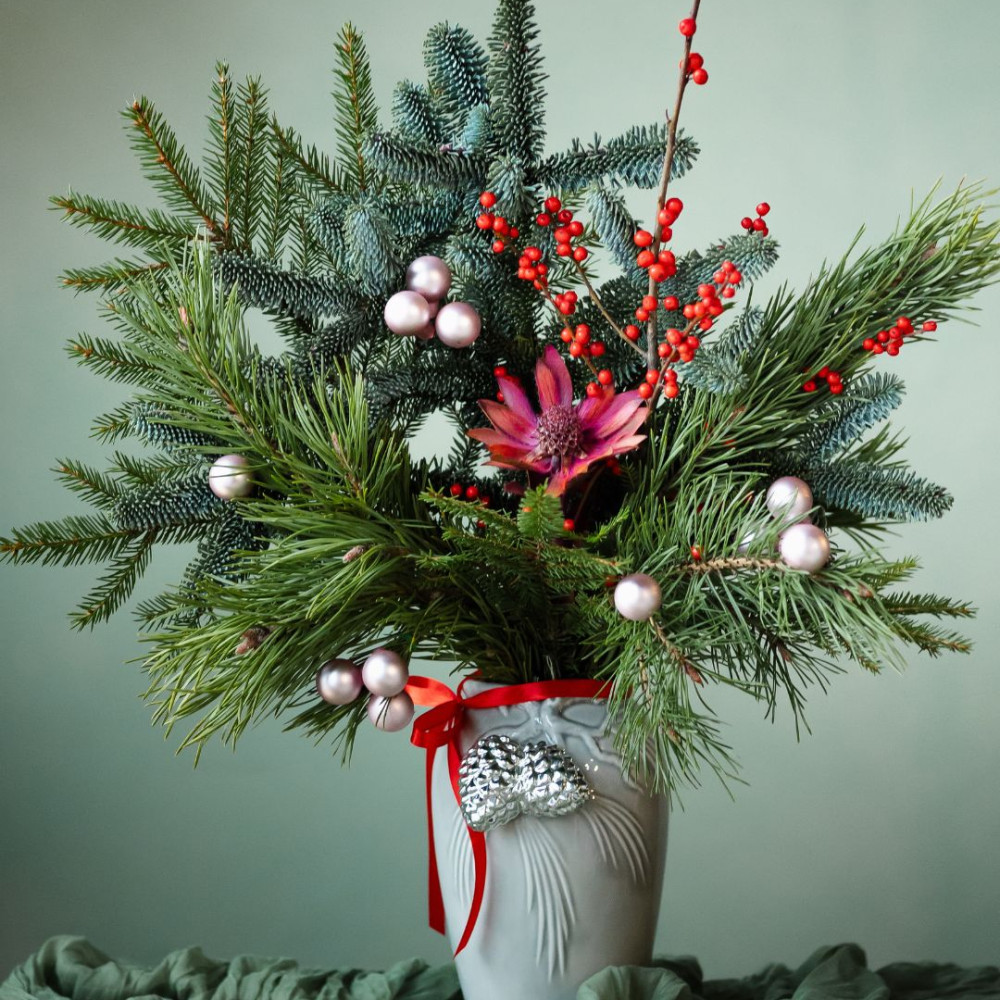 Новогодняя композиция в вазе — элегантный акцент для дома или праздничного стола. В основе — живые ветки нобилиса и сосны, дополненные декоративными веточками с ягодами и цветами. Стеклянные ёлочные шары придают композиции мягкое сияние и праздничное настроение.