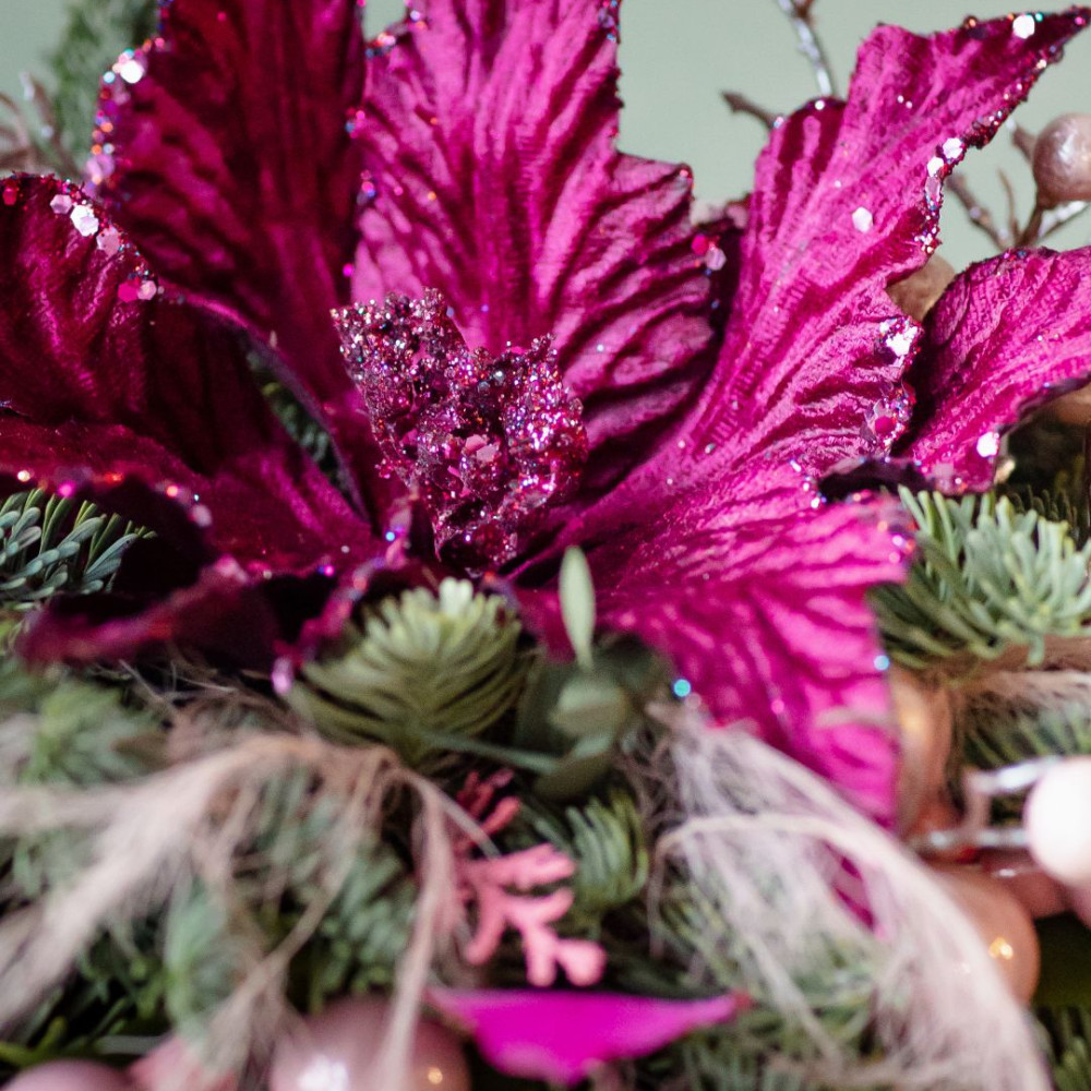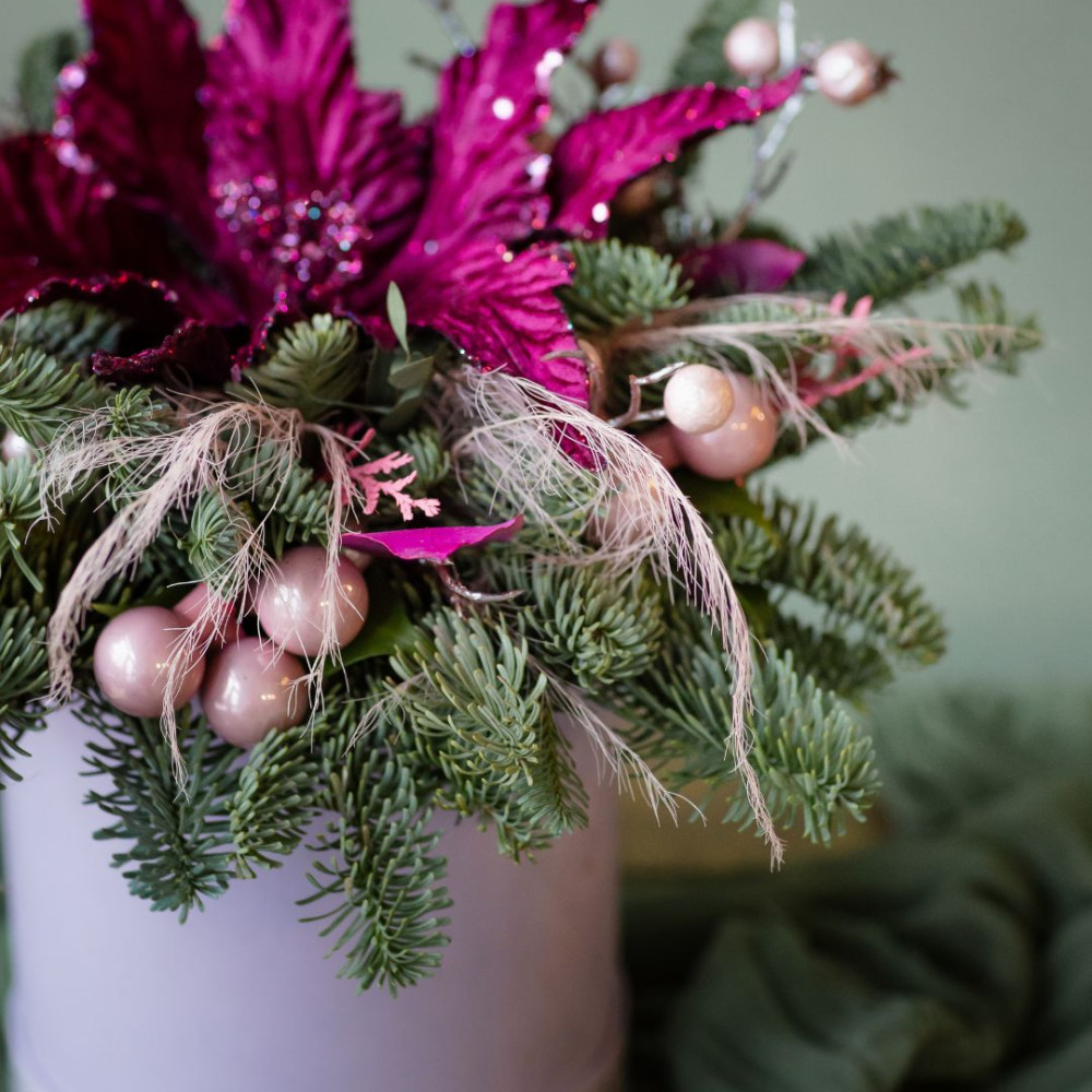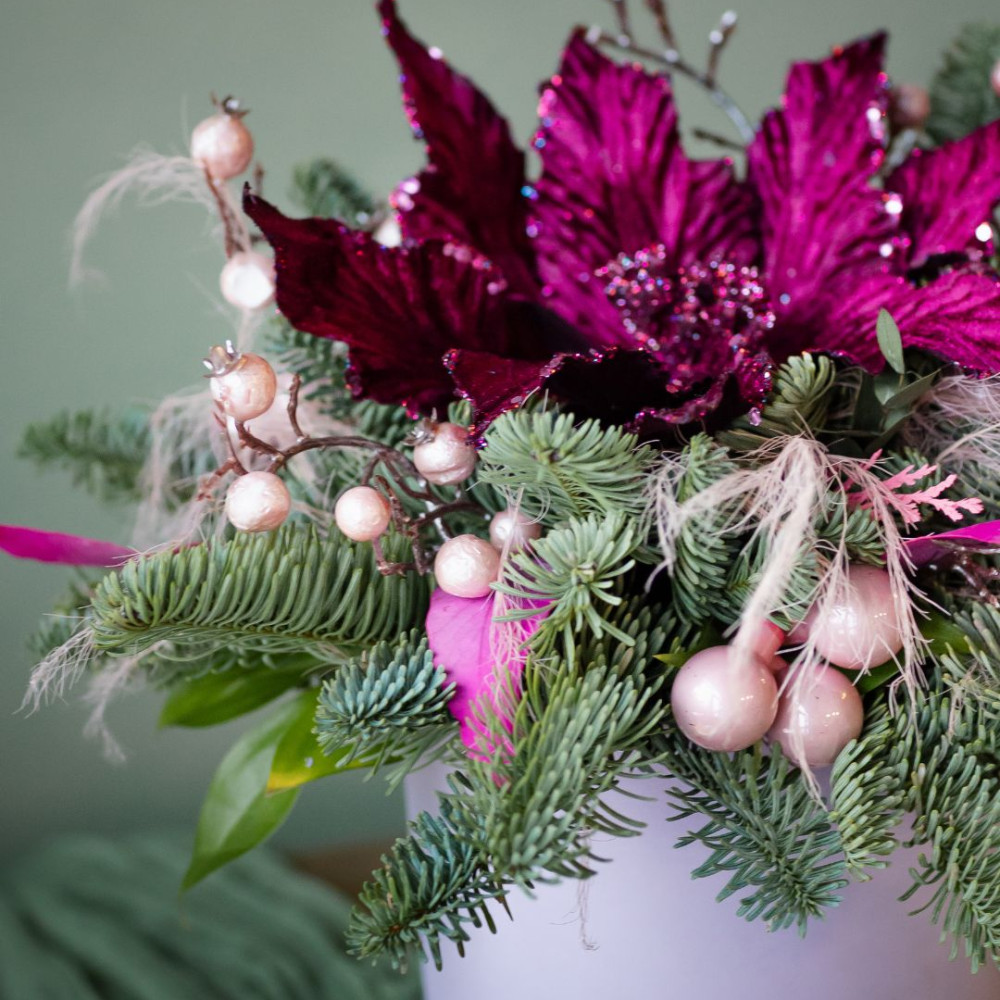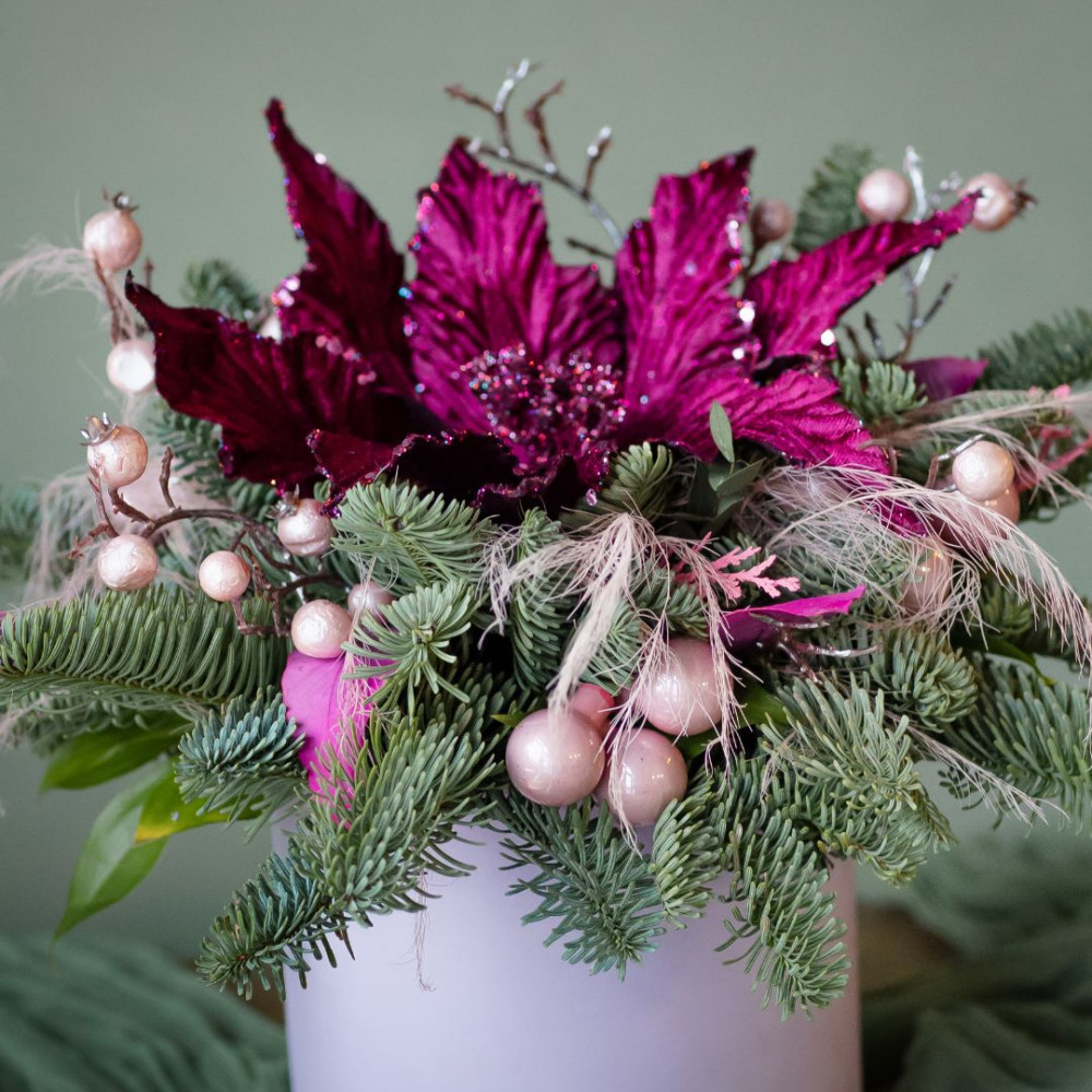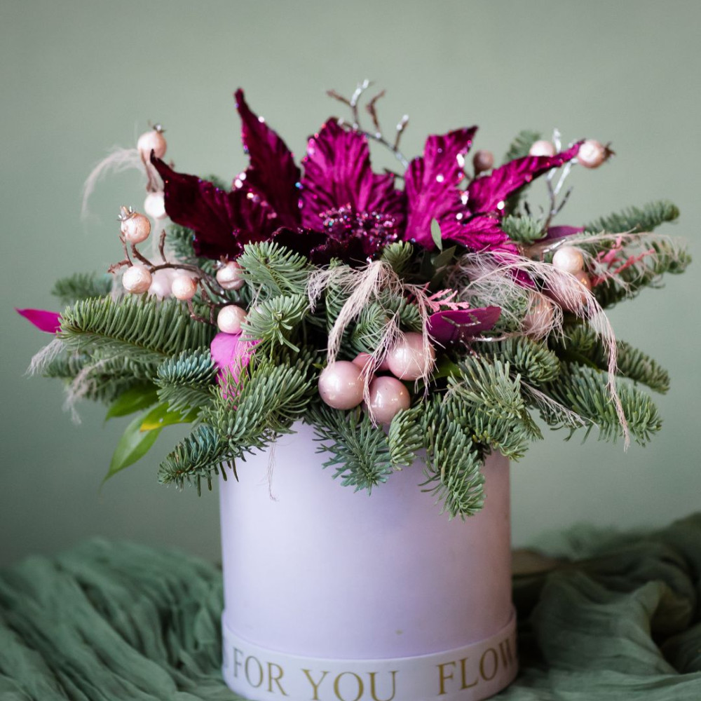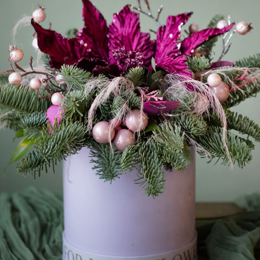 Новогодняя композиция в шляпной коробке с выразительным акцентом — декоративным цветком «Рождественская звезда». Его дополняют изящные декоративные веточки и лёгкие, воздушные сухоцветы, создавая ощущение уюта и спокойного праздничного настроения.