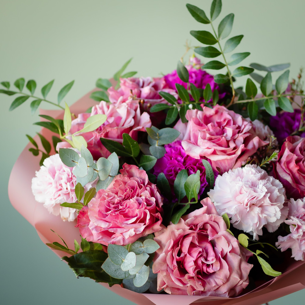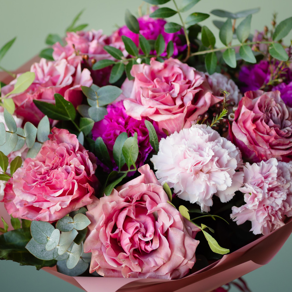 Шикарные розы и трепетные диантусы сплелись в нежном дуэте, словно два сердца, бьющиеся в унисон. Пушистый хамелациум и свежий эвкалипт добавляют букету лёгкости и глубины чувств. Идеальный выбор для признания в самый трогательный день в году.