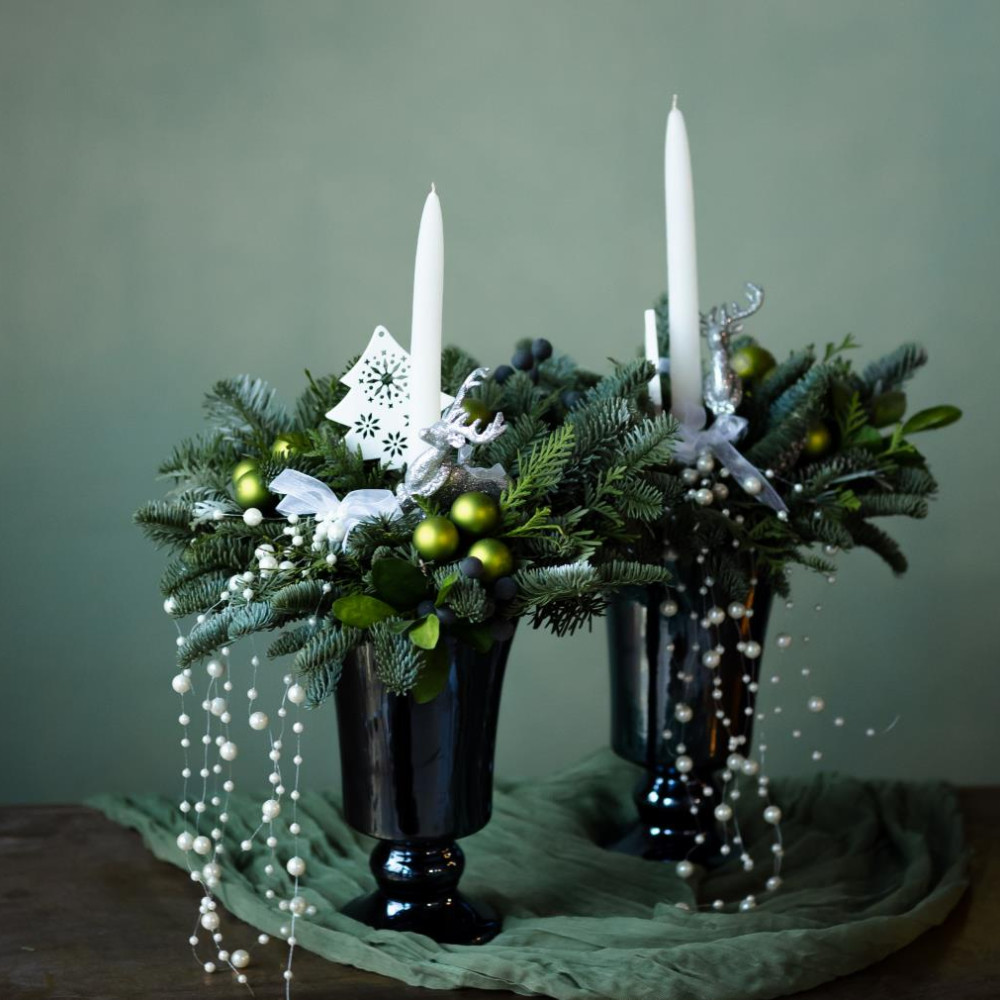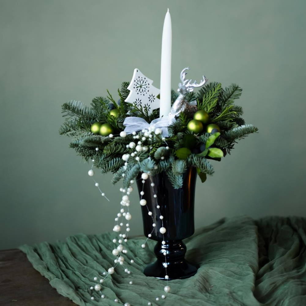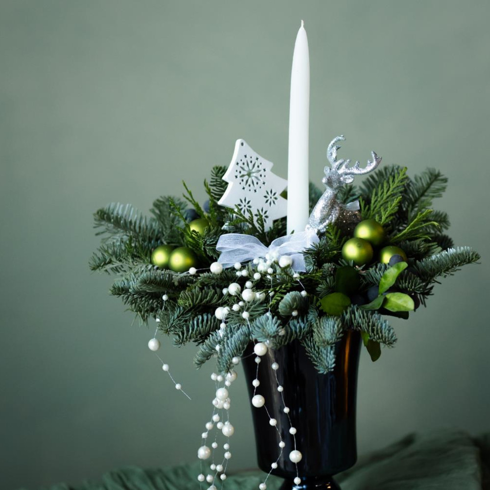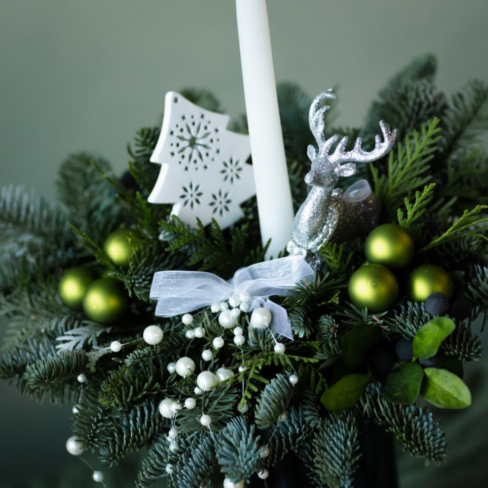 Композиция украшена пушистым нобилисом, декоративными ёлочными игрушками и свечой. Хвойная фактура придаёт ей ощущение уюта и зимней глубины, а мягкое сияние свечи создаёт тёплую, камерную атмосферу.