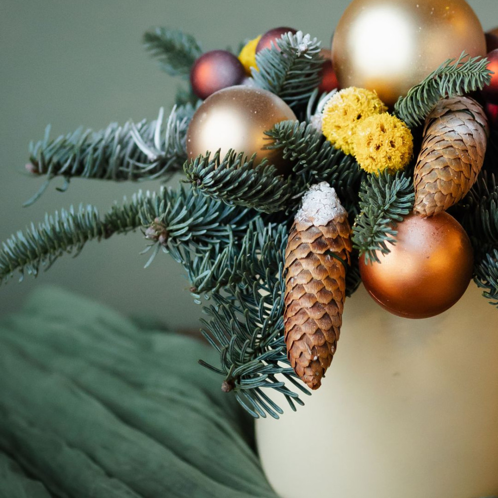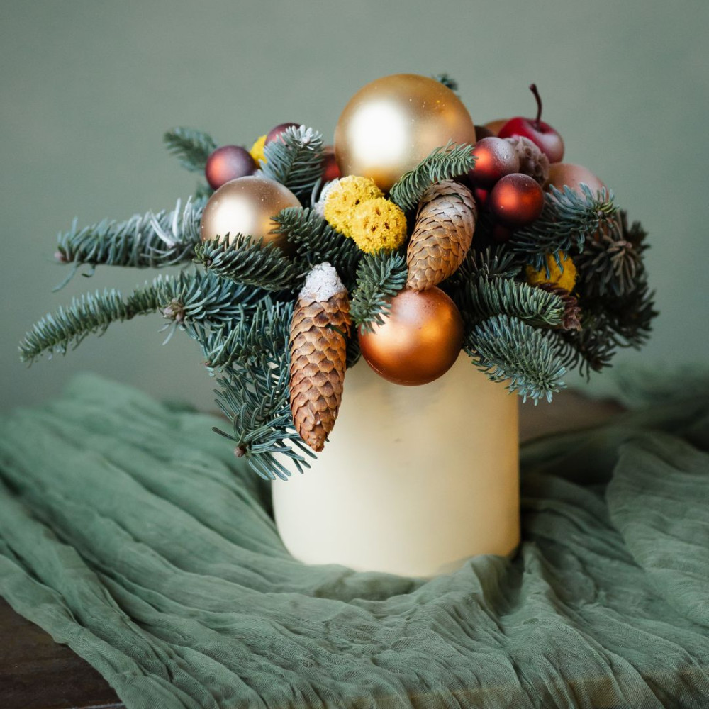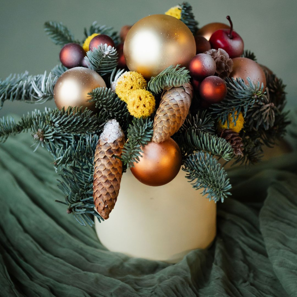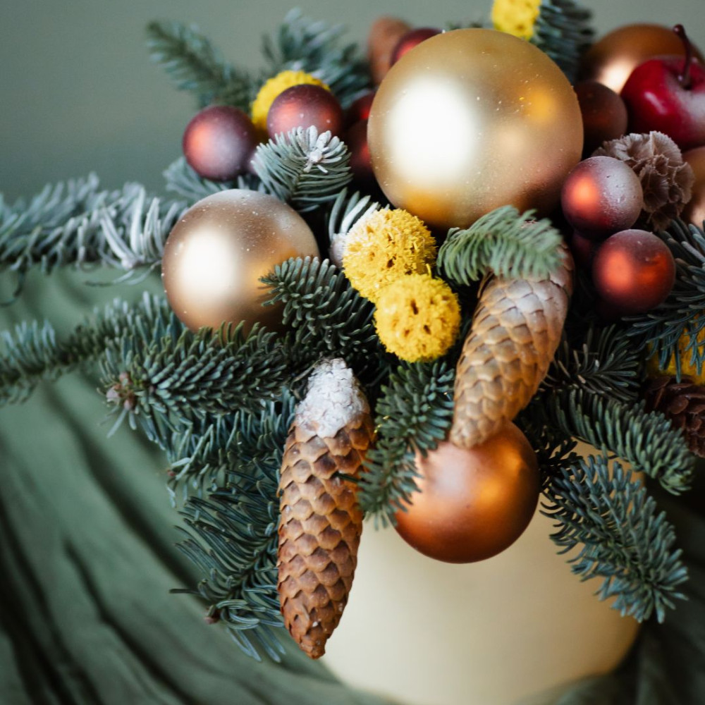 Новогодняя композиция в шляпной коробке, где живой нобилис сочетается с натуральными шишками, сухоцветами и стеклянными ёлочными шарами. Спокойная, фактурная и очень уютная — такая композиция создаёт ощущение зимнего леса и тёплого праздника.