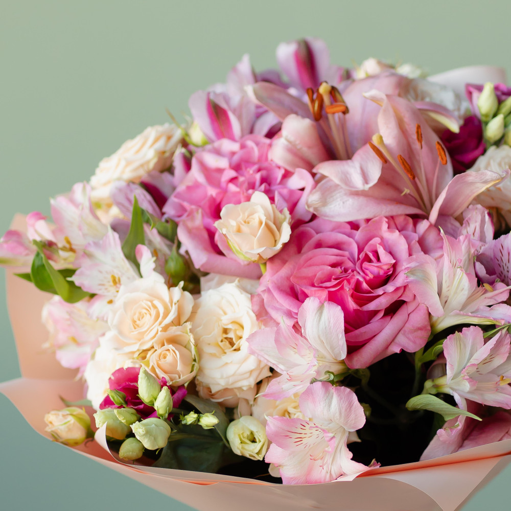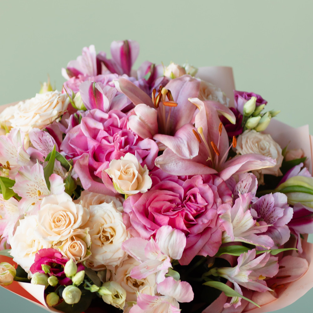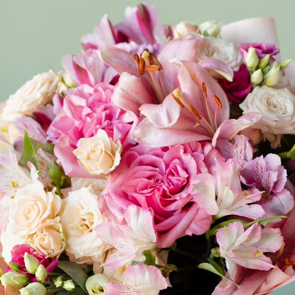 Букет "Клементина" — изысканная гармония розового в роскошном исполнении! Погрузитесь в мир нежности и роскоши с этой уникальной композицией. Трепетные кустовые розы, бесстыдно шикарные одноголовые розы, изысканная лилия, воздушная эустома и лёгкая альстремерия создают идеальный баланс оттенков и форм. Этот букет говорит на языке чувств и станет ярким акцентом любого торжества.