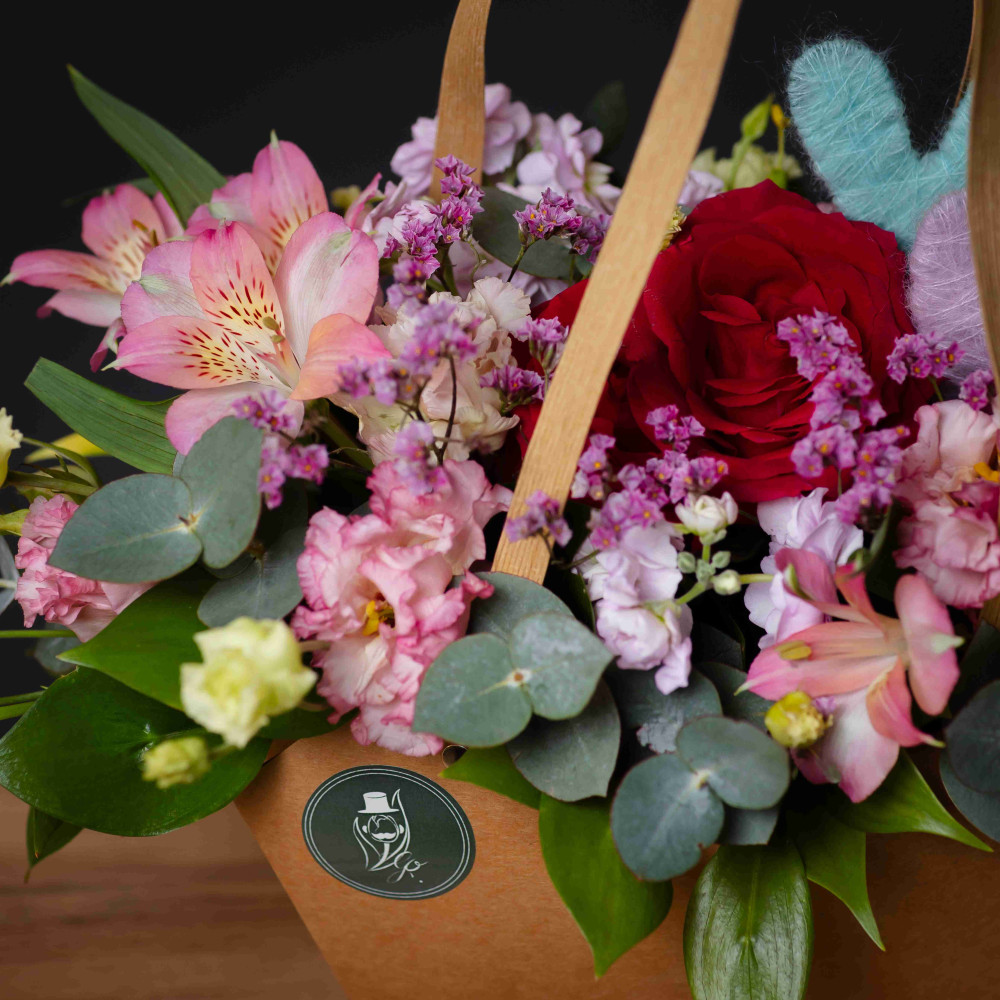 Сердце композиции - пышная красная роза, словно королева в окружении свиты из нежных альстромерий, эустомы и матиолы. Дополнено тематическими сердечками из пушистого мохера.