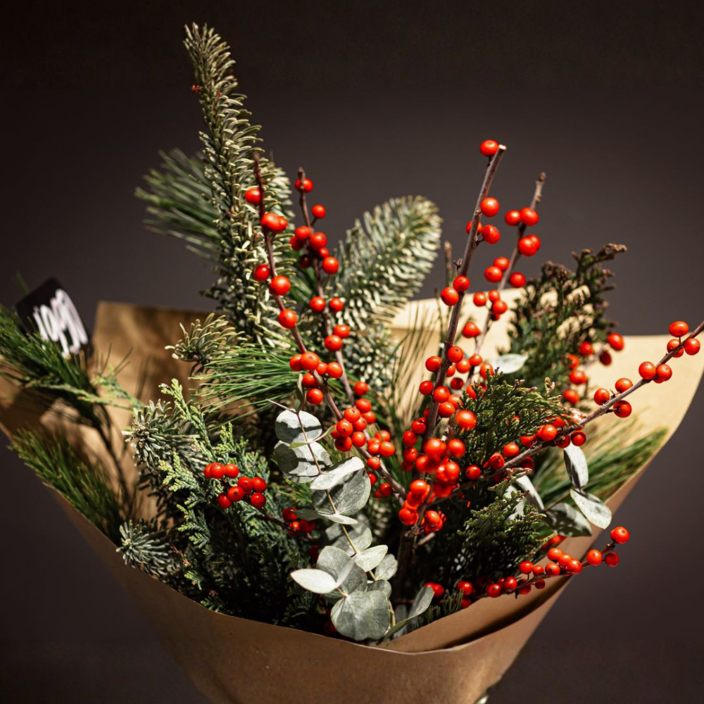 Букет из душистого нобилиса, сосны и свежего эвкалипта — это чистый аромат зимнего леса, собранный в одном нежном, воздушном объятии. Яркие ягодные акценты илекса (падуба) или гиперикума добавляют композиции праздничного настроения и делают букет выразительным, жизнерадостным и очень новогодним.