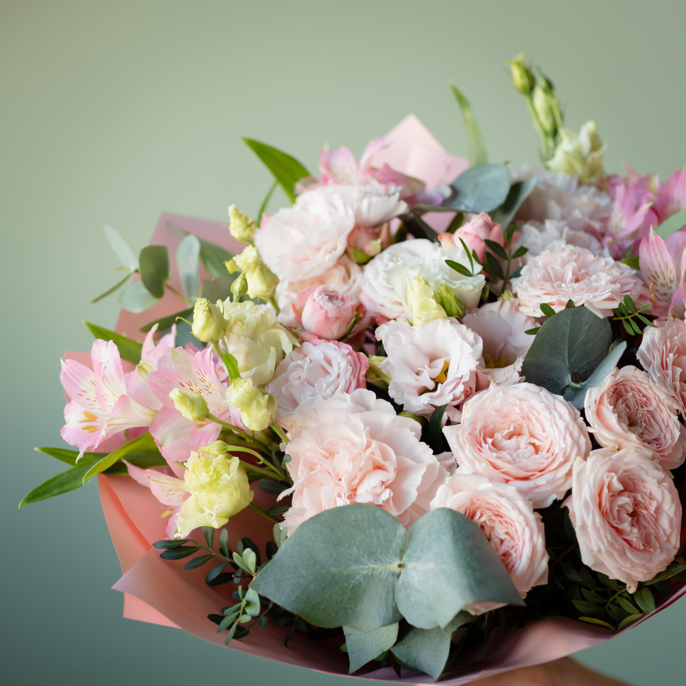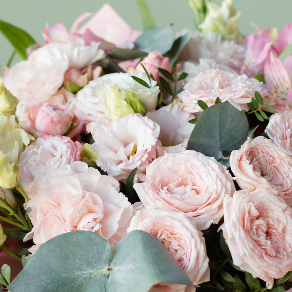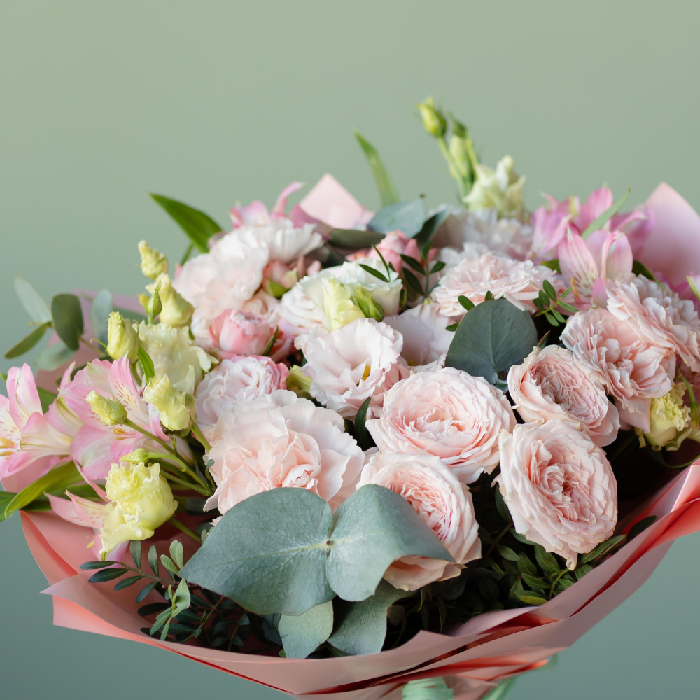 Микс кустовых роз, эустомы и альстремерии в нежных розово-кремовых оттенках