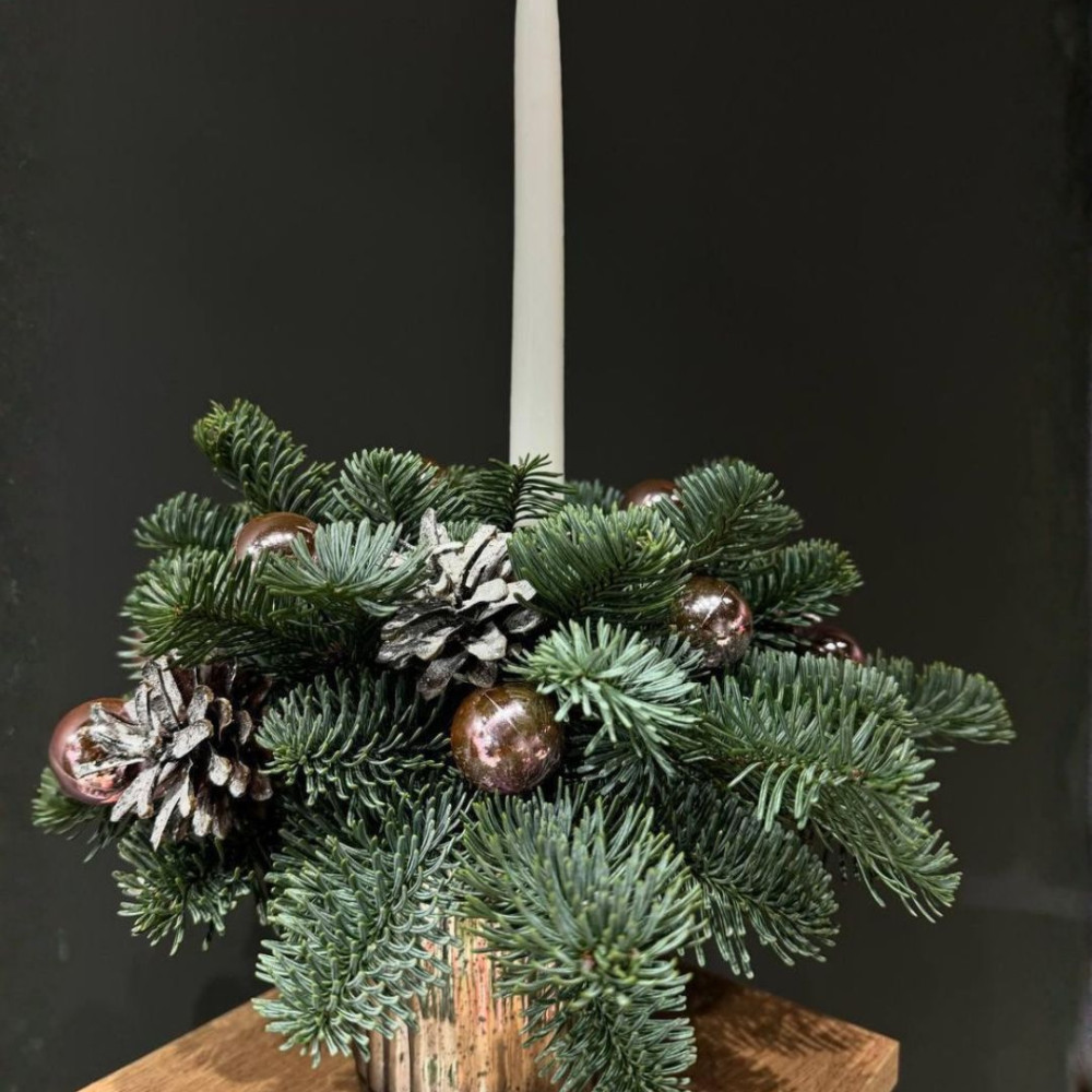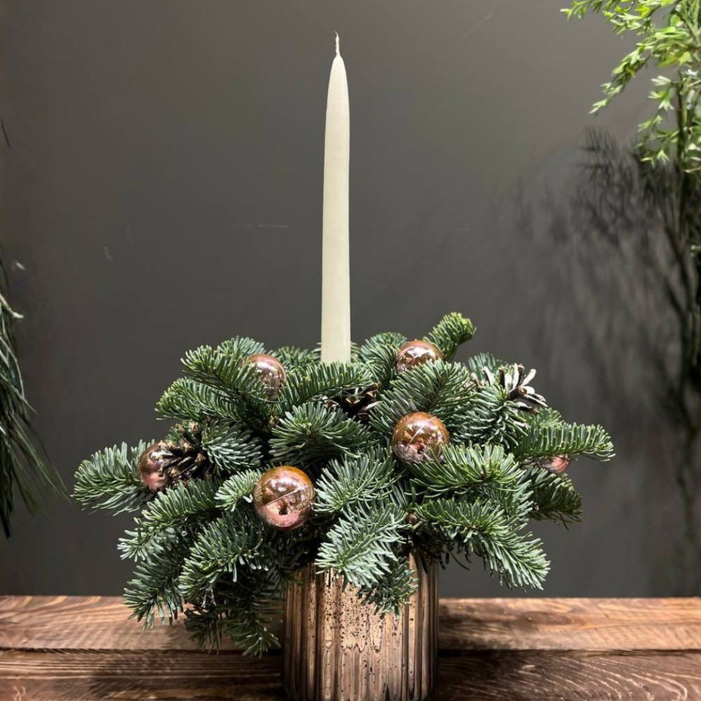 Стильная новогодняя композиция в стеклянном подсвечнике создаёт атмосферу тепла и уютного зимнего вечера. Пышные веточки нобилиса дополняются декоративными элементами, а в центре мягко мерцает свеча, наполняя пространство праздничным сиянием.