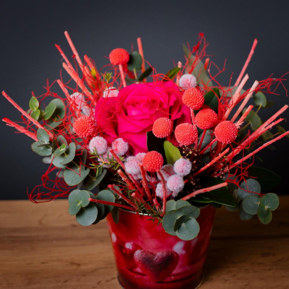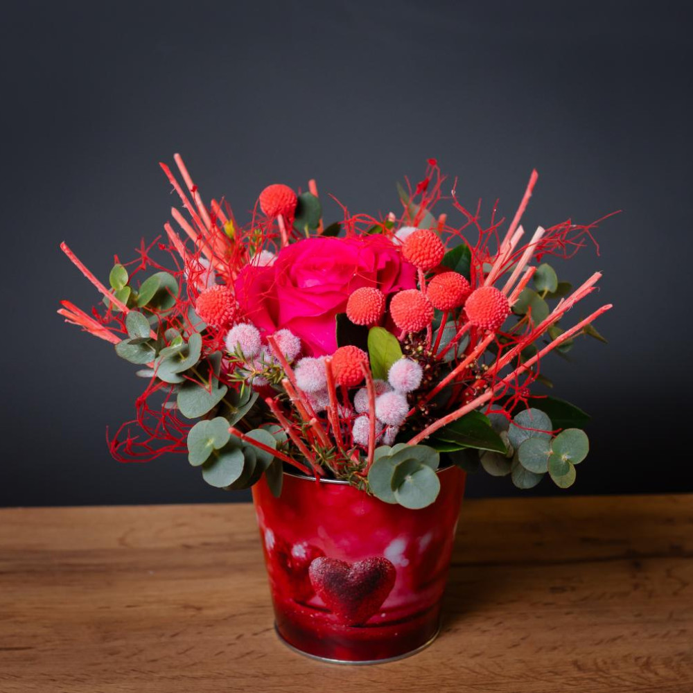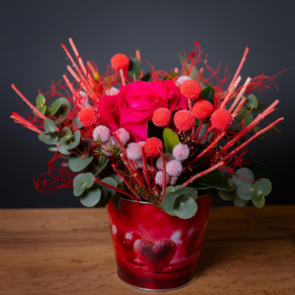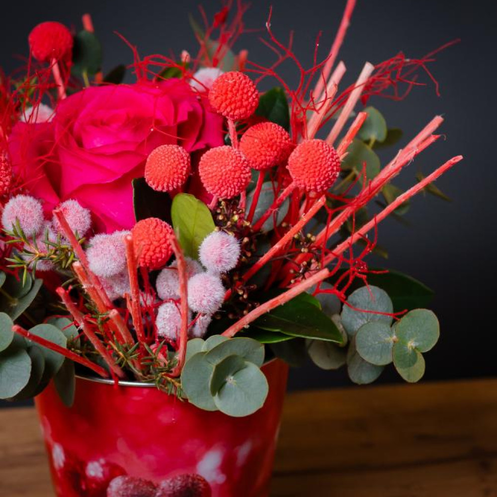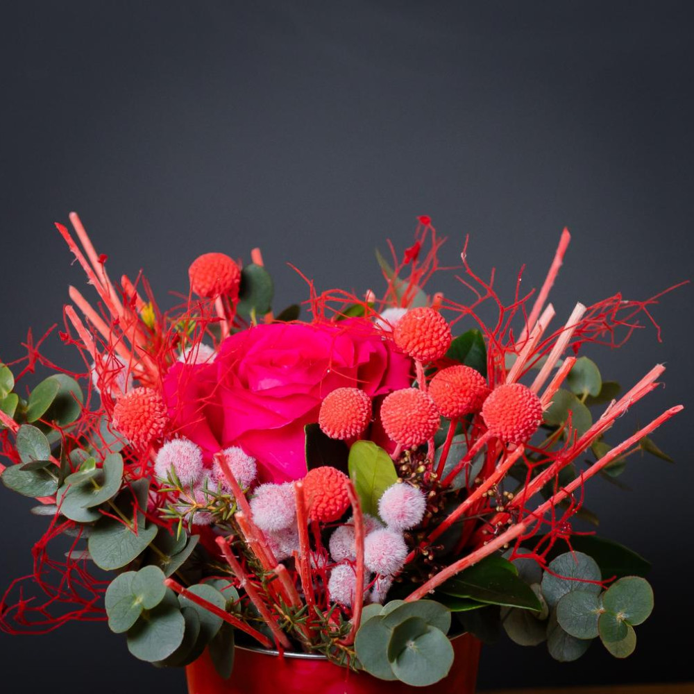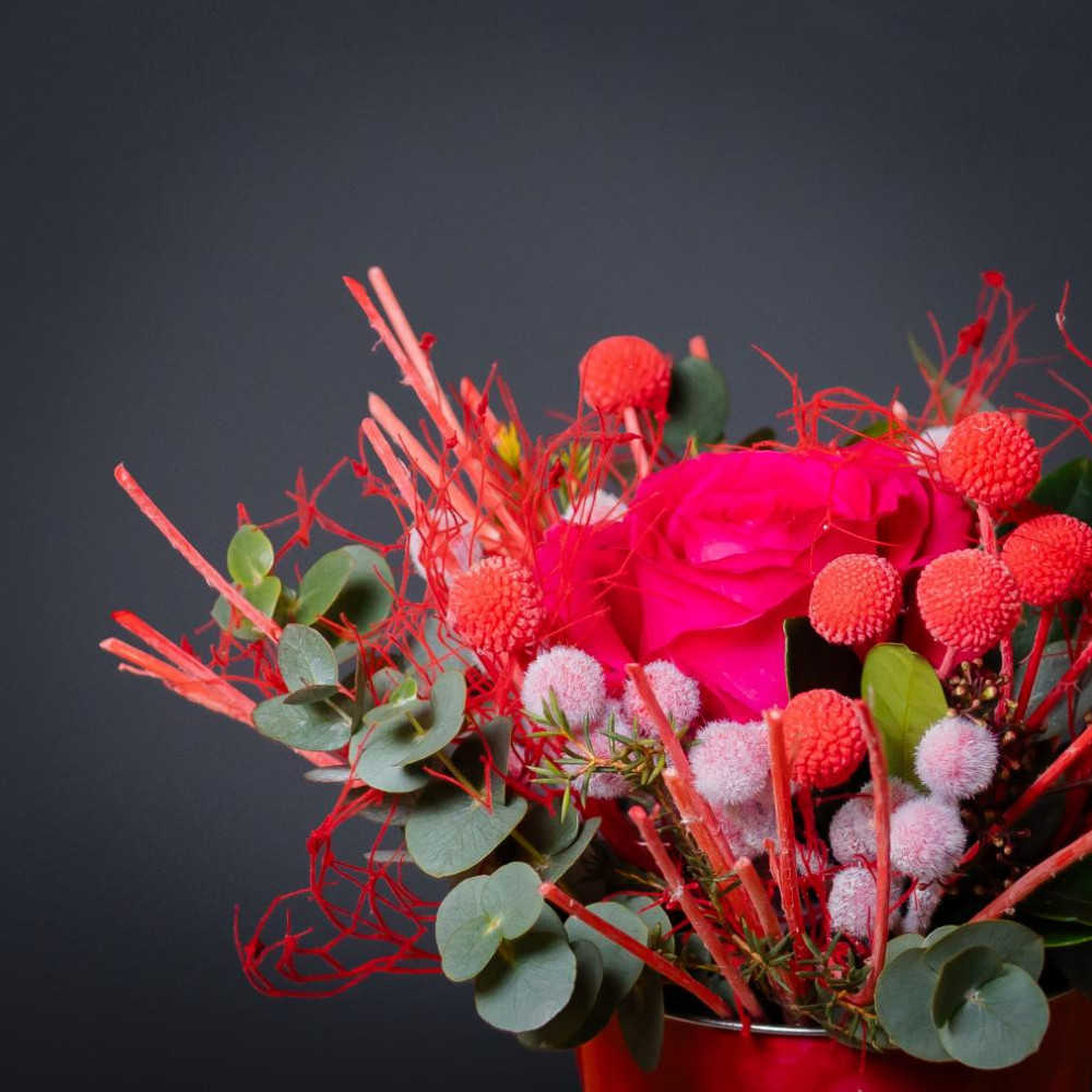 Стильный знак внимания в тематическом жестяном кашпо. Яркая роза, красные ягоды и благородный эвкалипт в обрамлении стабилизированных цветов, которые будут радовать долгие месяцы. Кашпо с праздничным дизайном — самостоятельное украшение интерьера. Готовый подарок без лишней упаковки.
