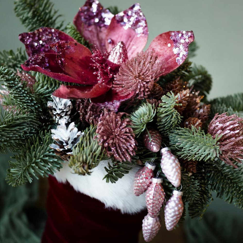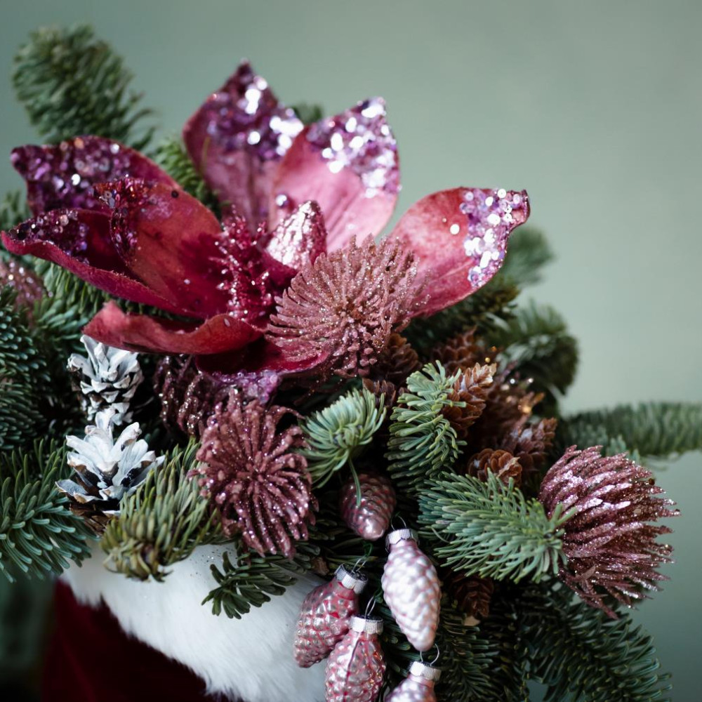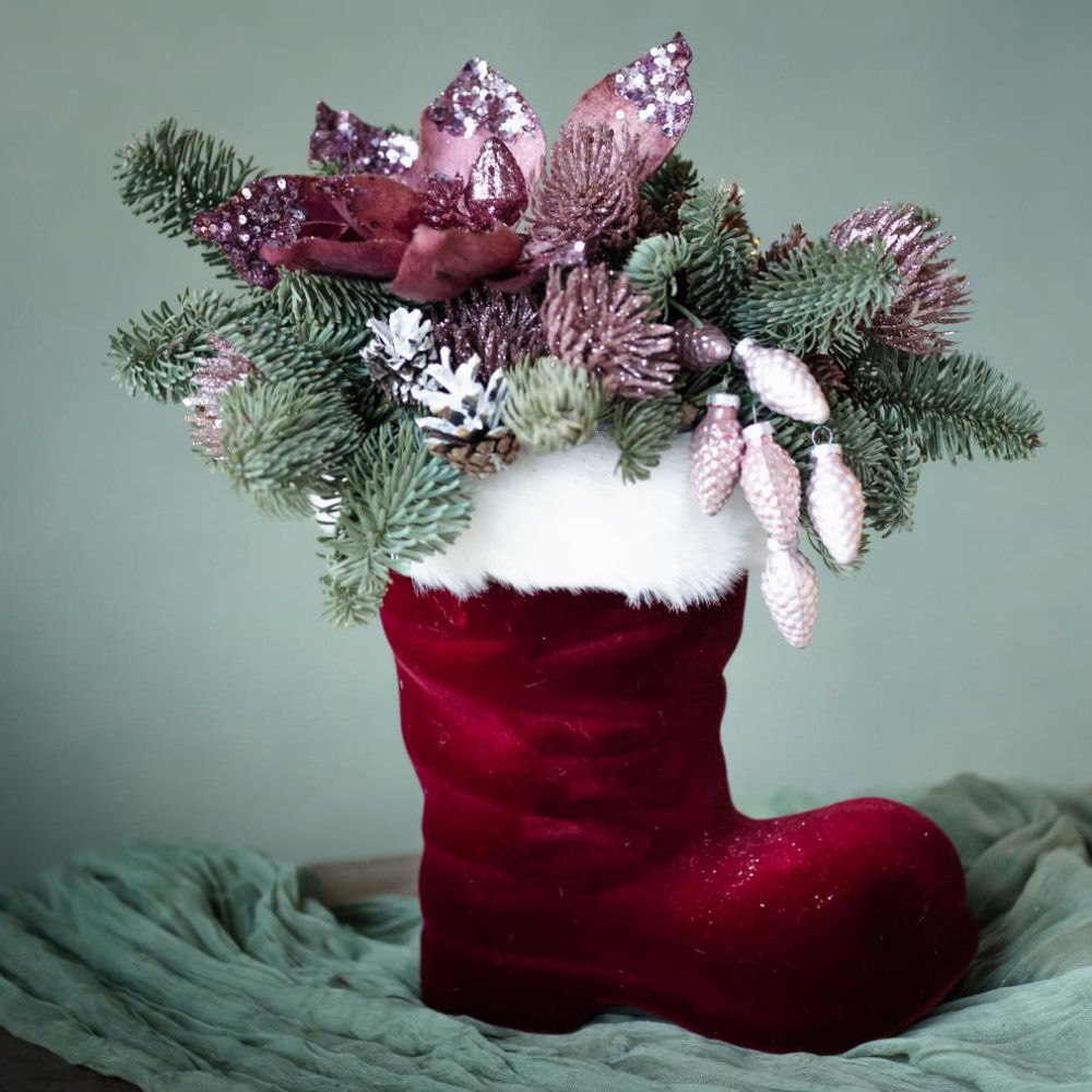 Композиция в сапоге Деда Мороза — это яркий, праздничный акцент, который создаёт атмосферу настоящей новогодней сказки. Основа — бархатный жёсткий сапог высотой 25 см, украшенный густой хвоей и декоративными элементами. Общая высота композиции — около 37 см.