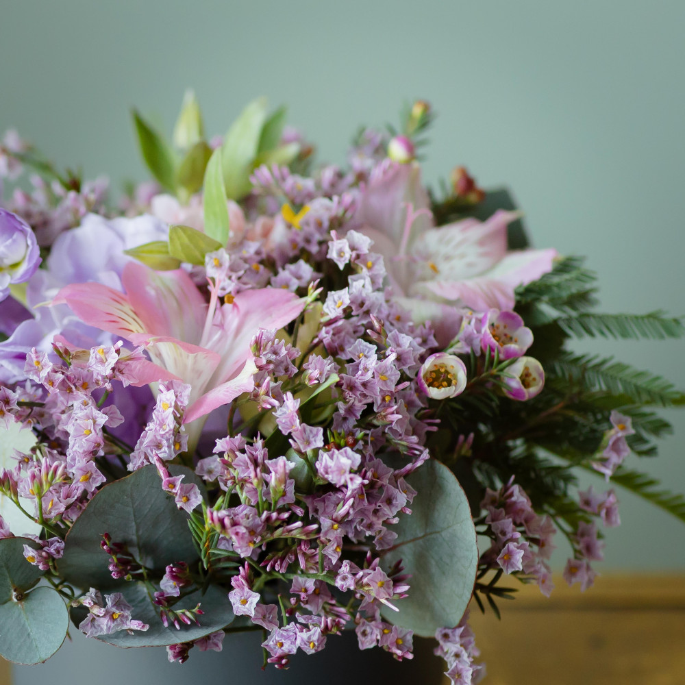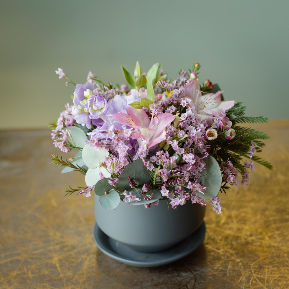 Композиция в керамическом кашпо — изящный и трогательный комплимент. Нежное сочетание матиолы, альстромерии и хамелациума в розовато-сиреневых тонах создают ощущение чистоты, легкости и счастья. Кашпо остается у получателя и в дальнейшем используется для комнатных цветов.
