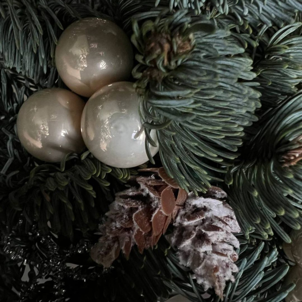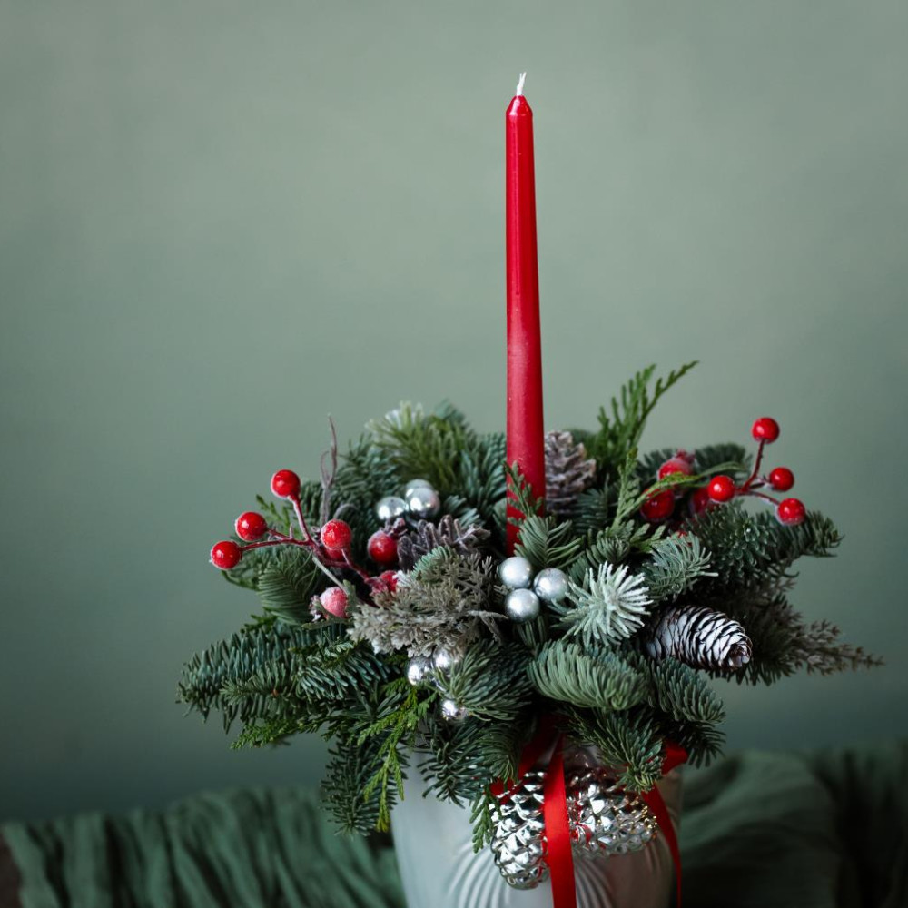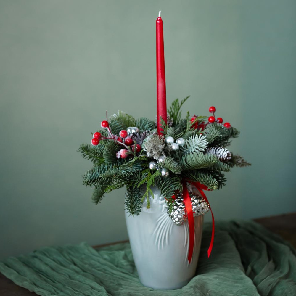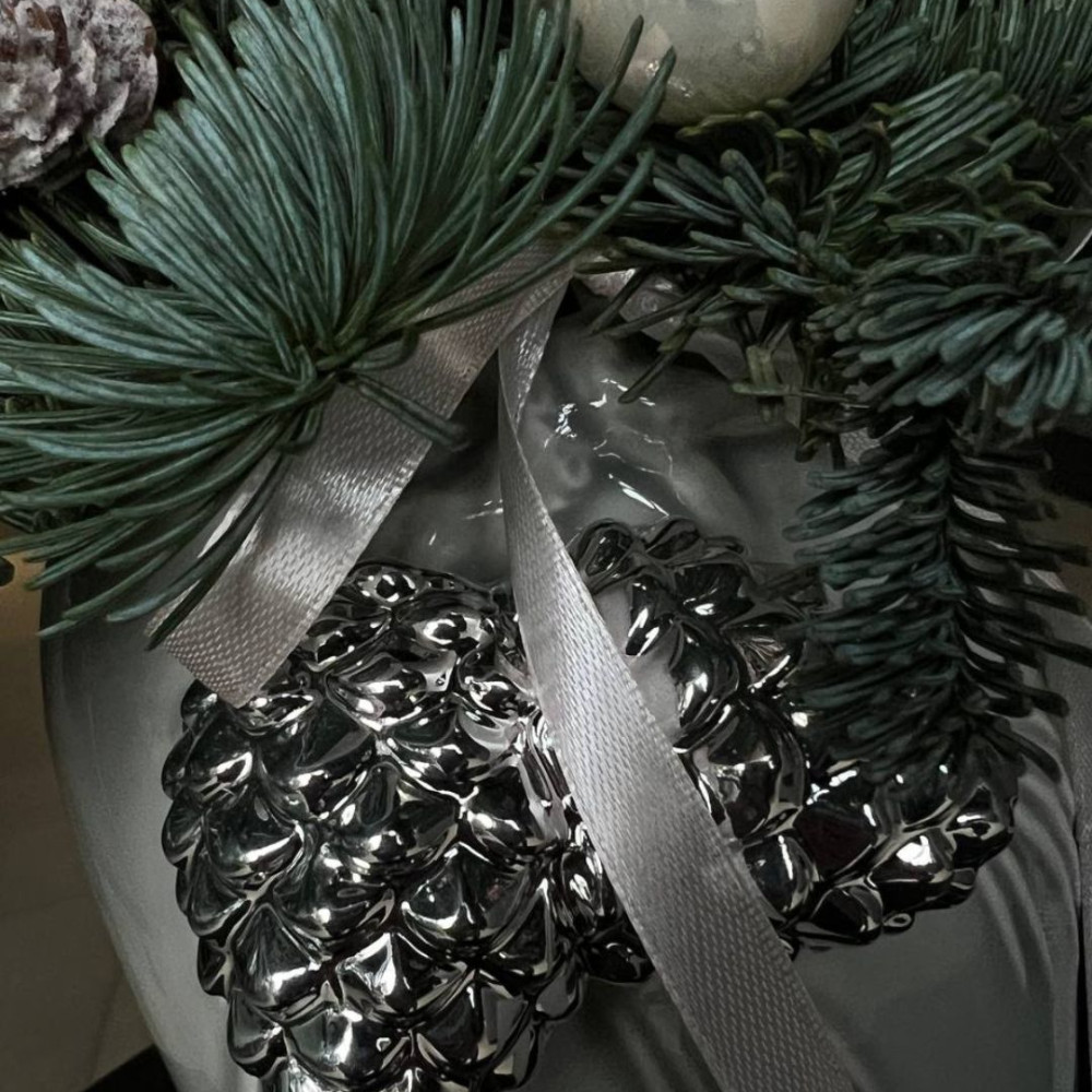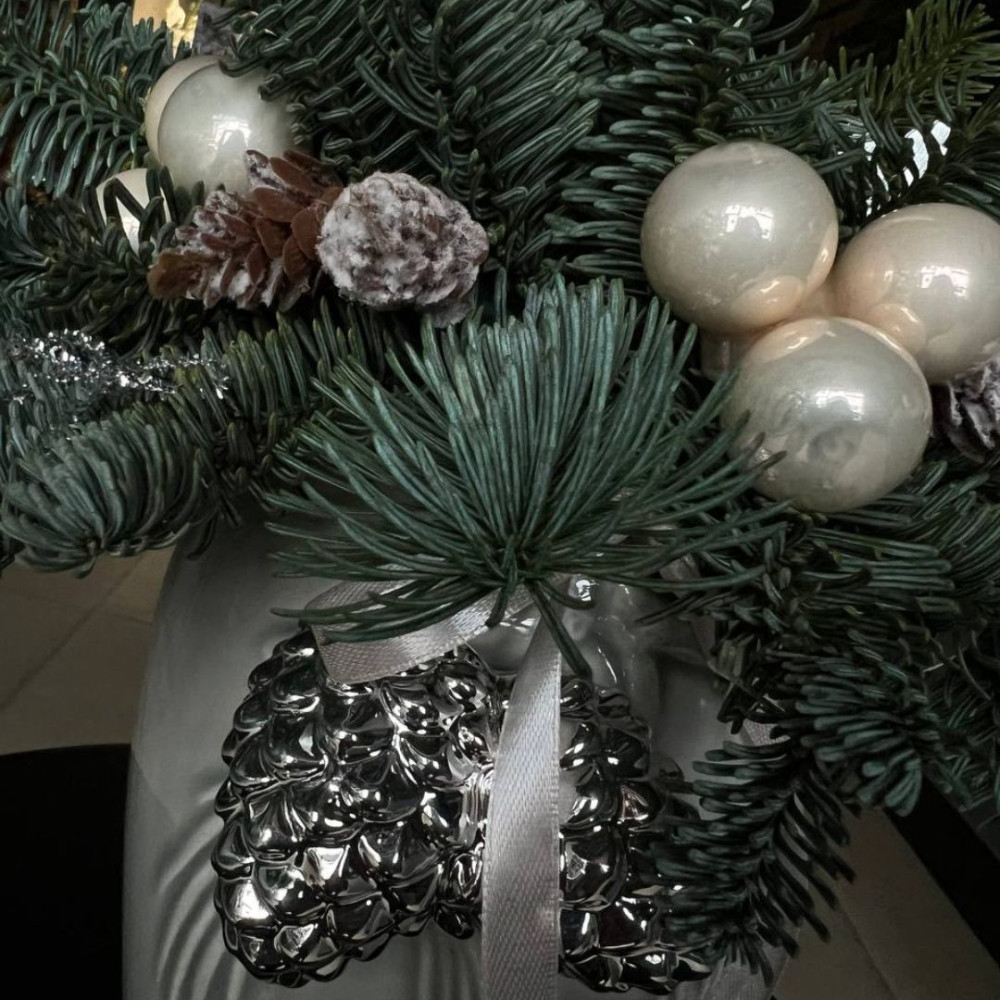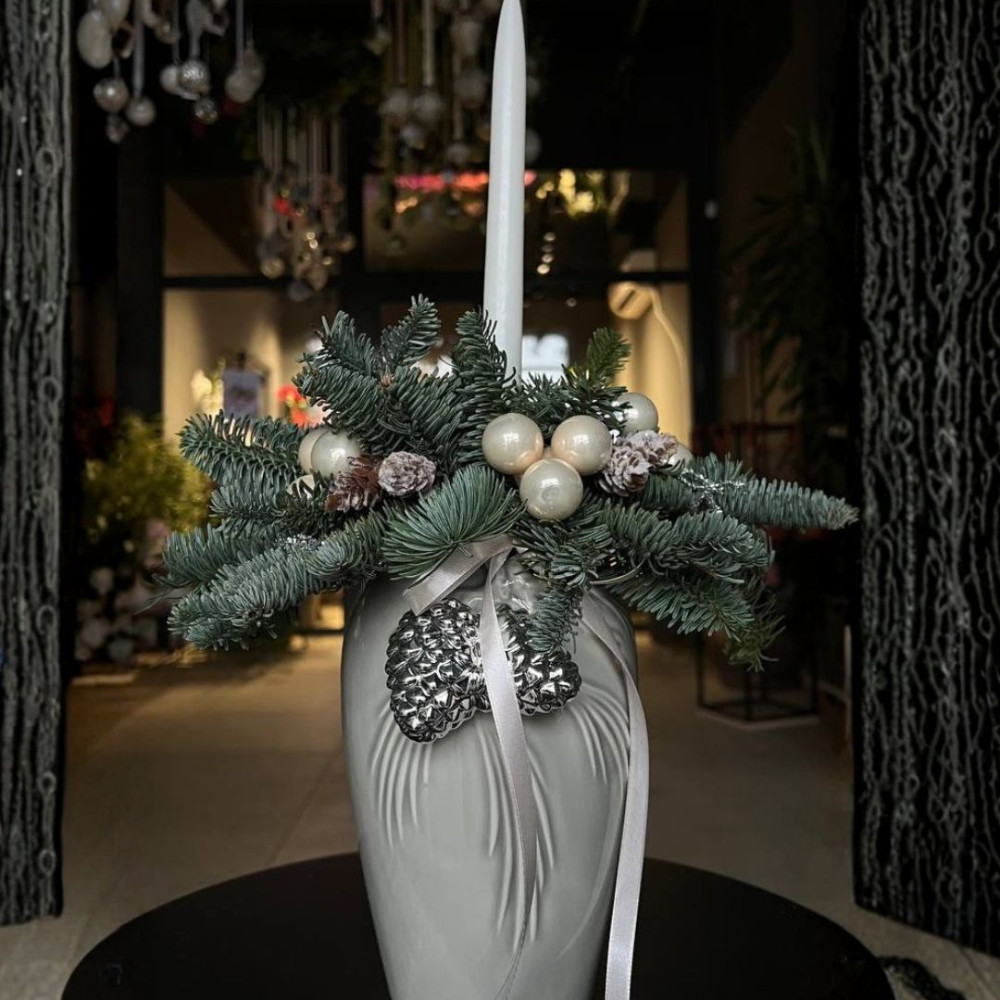 Изысканный новогодний акцент, созданный для тех, кто ценит утончённость и атмосферу зимнего спокойствия. Пышные ветви нобилиса размещены в элегантной фарфоровой вазе, а декоративная свеча добавляет мягкий теплый свет, словно огонёк праздничного ожидания.