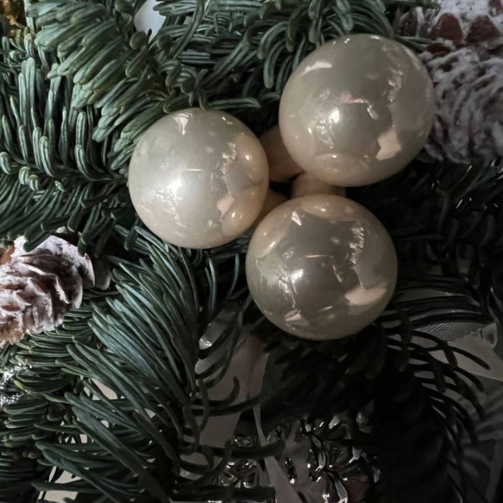 Композиция украшена натуральными шишками и стеклянными елочными игрушками, которые создают благородное мерцание и подчёркивают праздничный характер работы. Наполнение вазы возможно в разных цветовых вариантах.