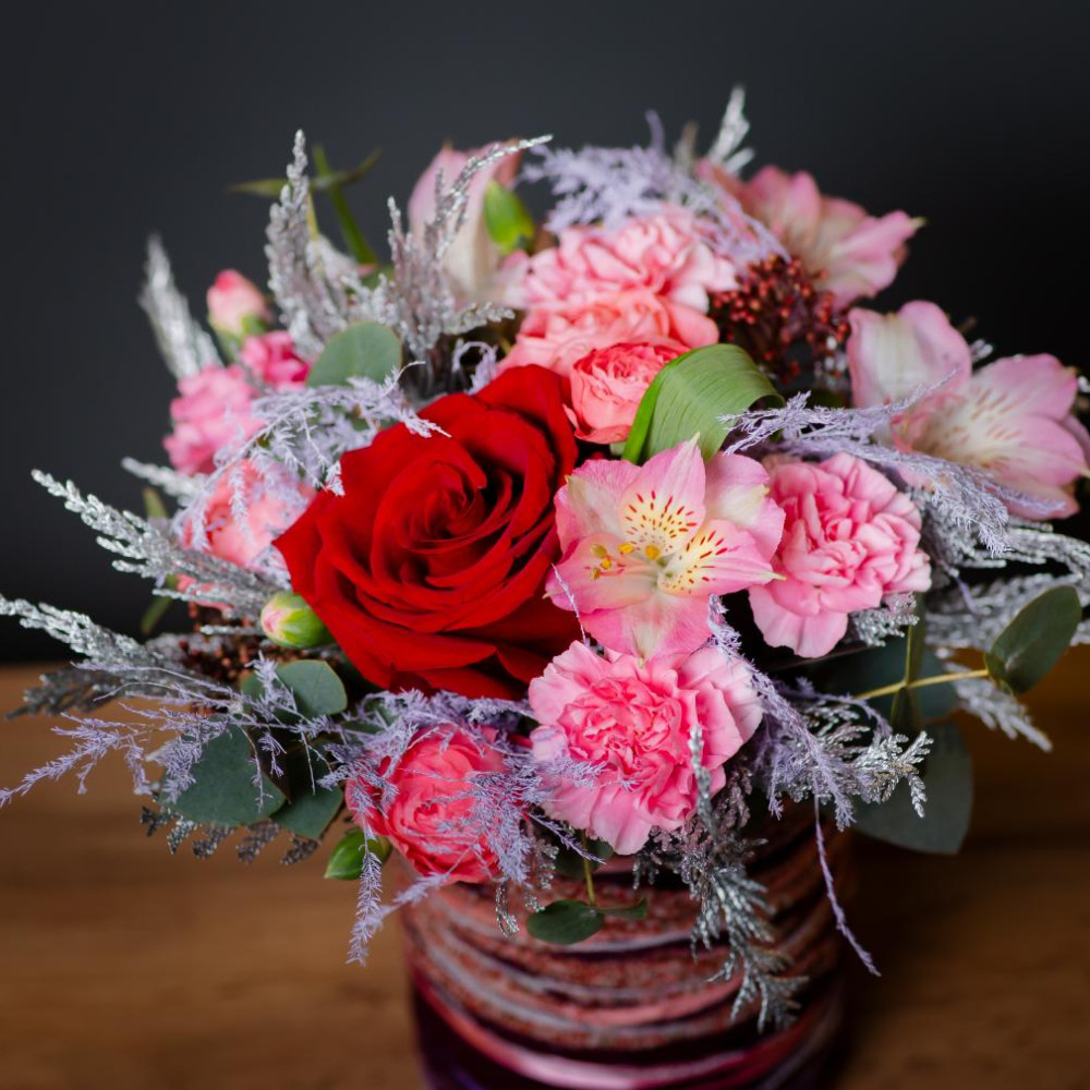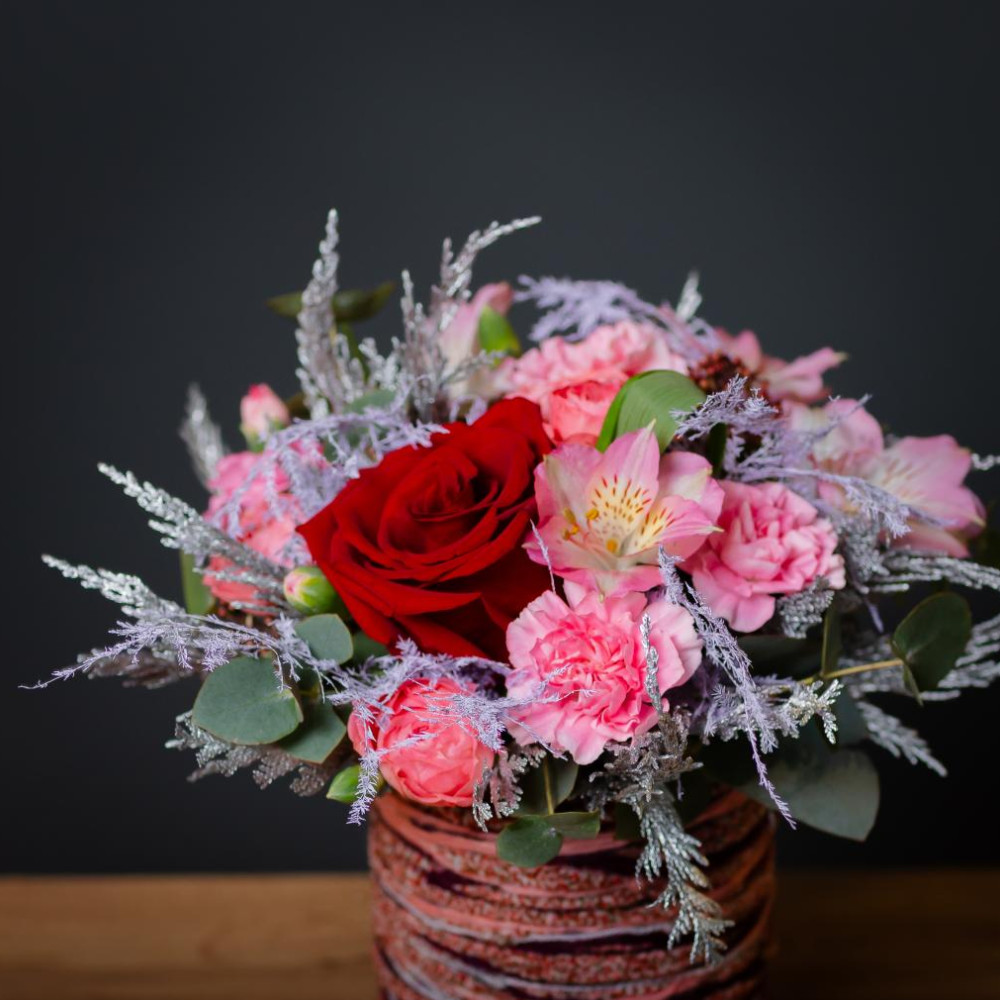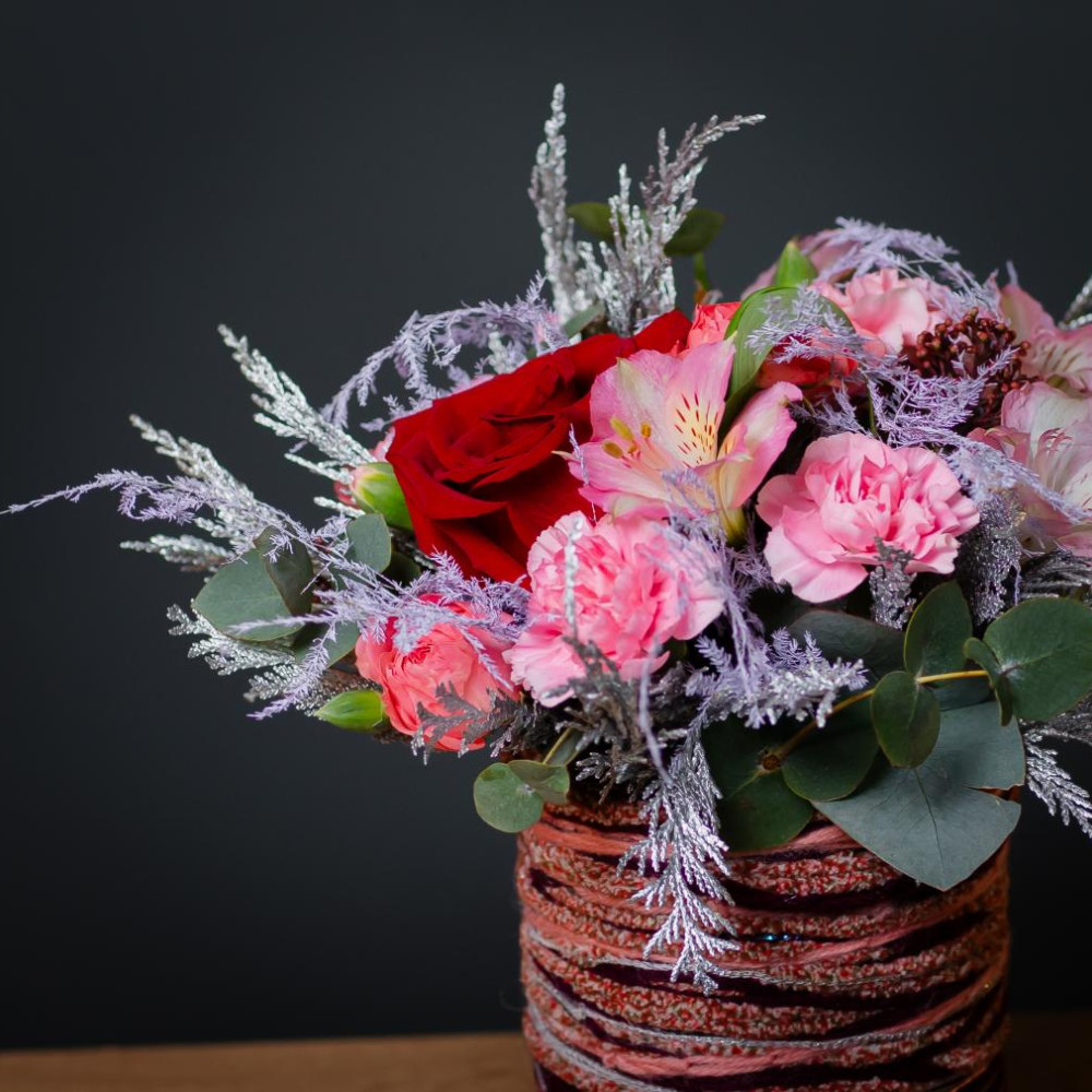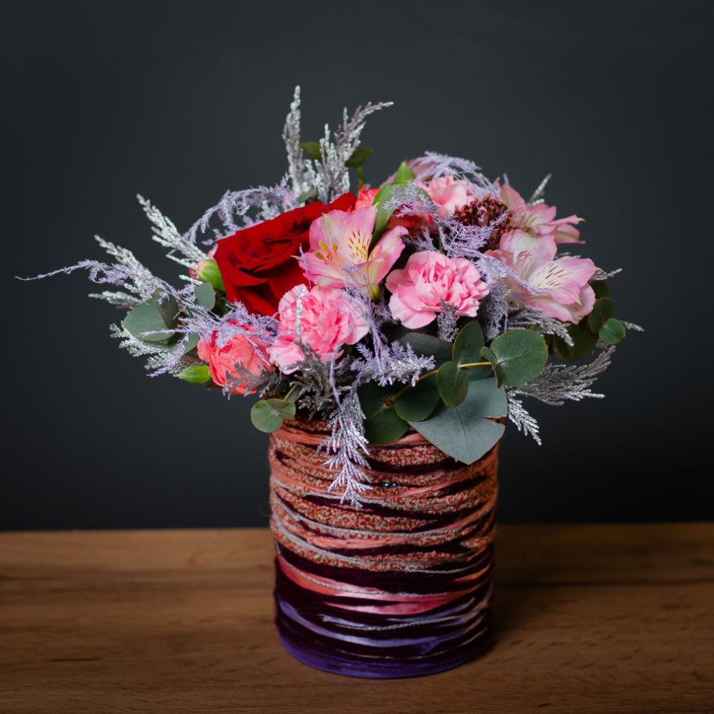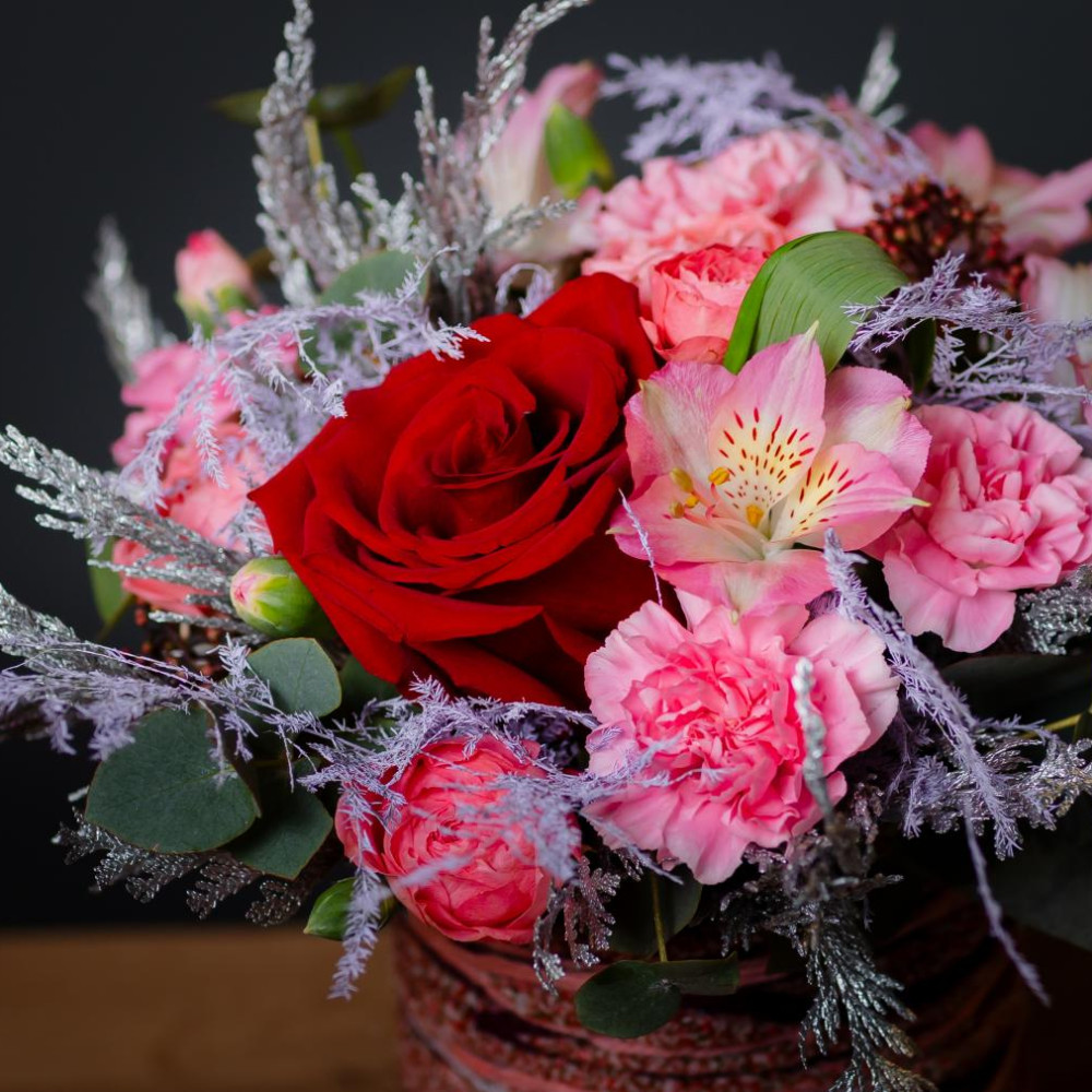 Изысканный подарок с акцентом на детали. Яркая роза в обрамлении нежно-розовых диантусов и воздушной альстремерии, сочная зелень эвкалипта и пушистые веточки кипарисовика — в стильной шляпной коробке, декорированной цветной тесьмой. Идеальный баланс формы, цвета и текстуры.