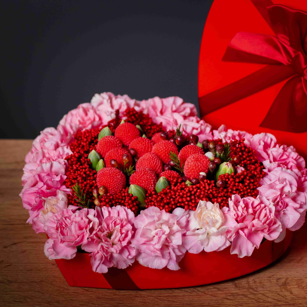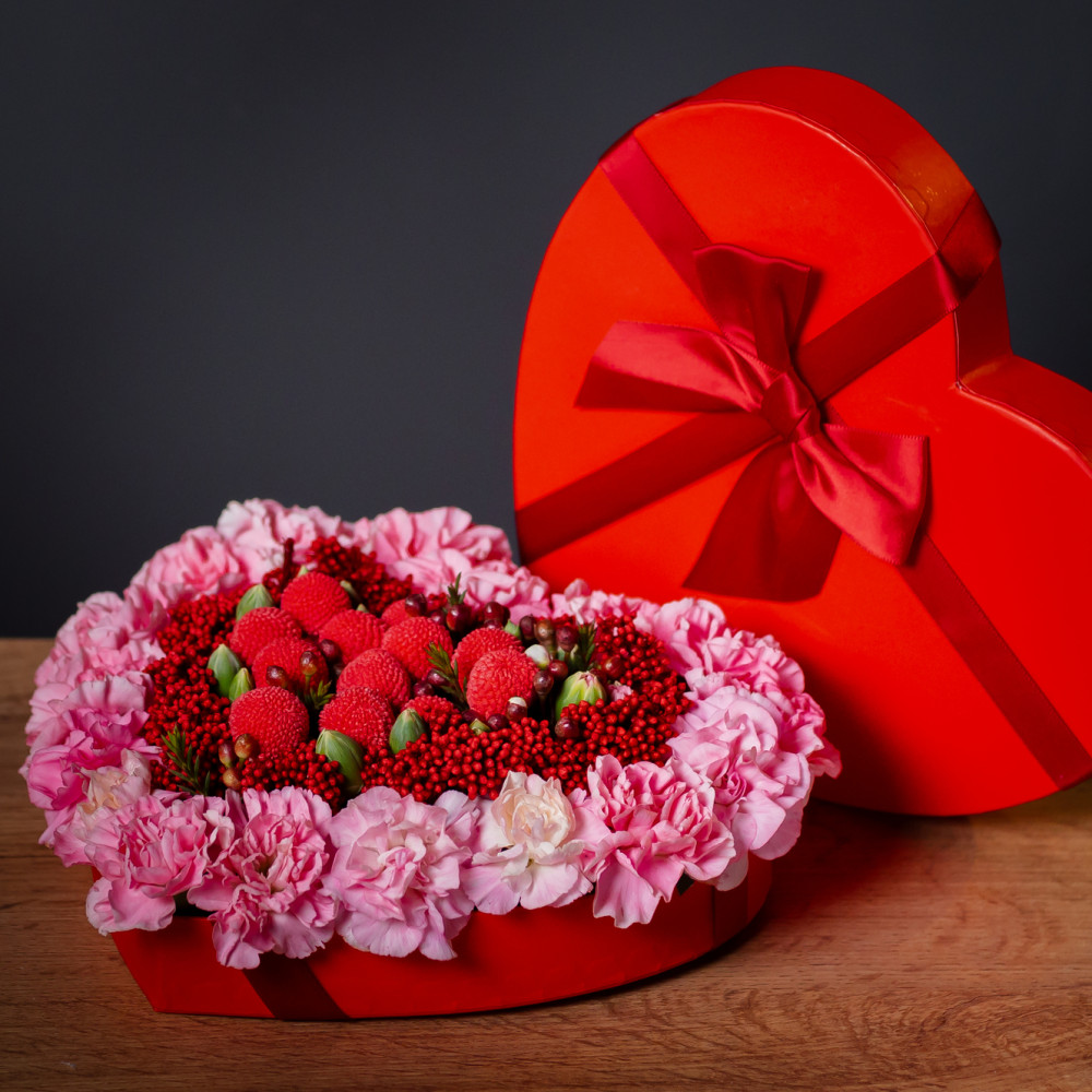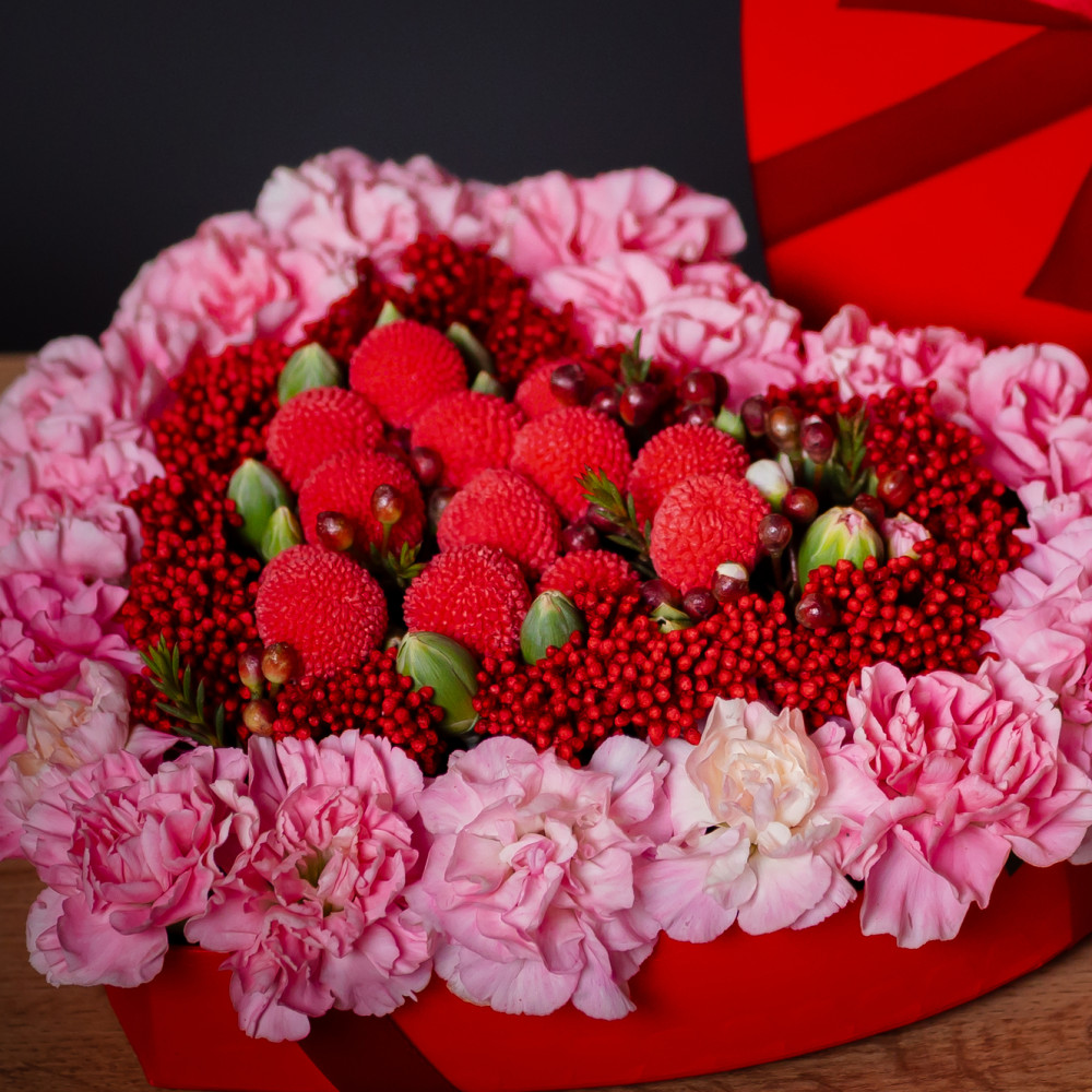 Композиция "Валентинка" — уникальный комплимент для вашей Дамы Сердца! Микс красных ягод в обрамлении нежной розовой кустовой гвоздики. Ягоды несъедобные.