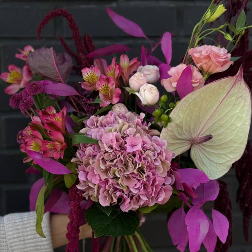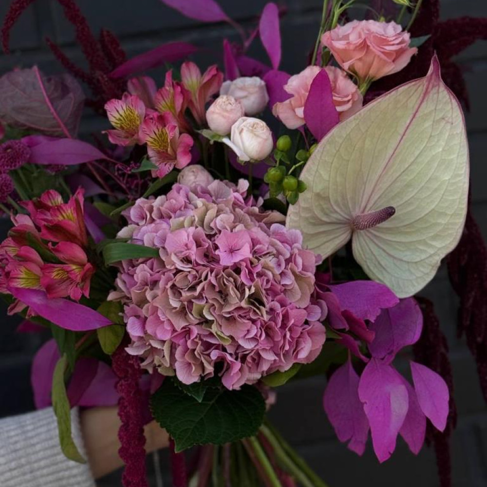 "Колдовские чары " - фиолетовая симфония страсти и тайны. Глубокие переливы гортензии, магический блеск антуриума, нежность альстремерии и амаранта, изысканность эустомы и мягкость кустовой розы создают образ, полный загадочности и чувственности. Идеален для тех, кто верит в магию мгновений и хочет подчеркнуть уникальность своих чувств.