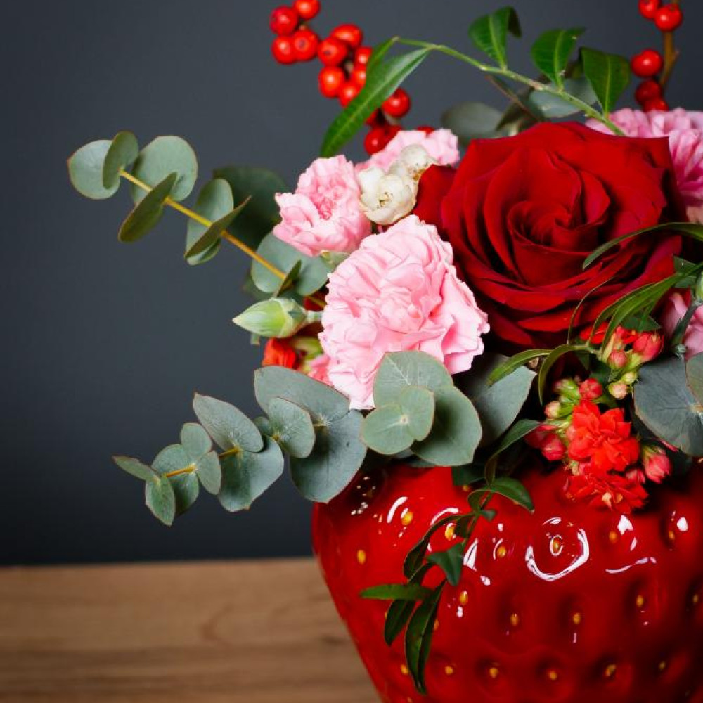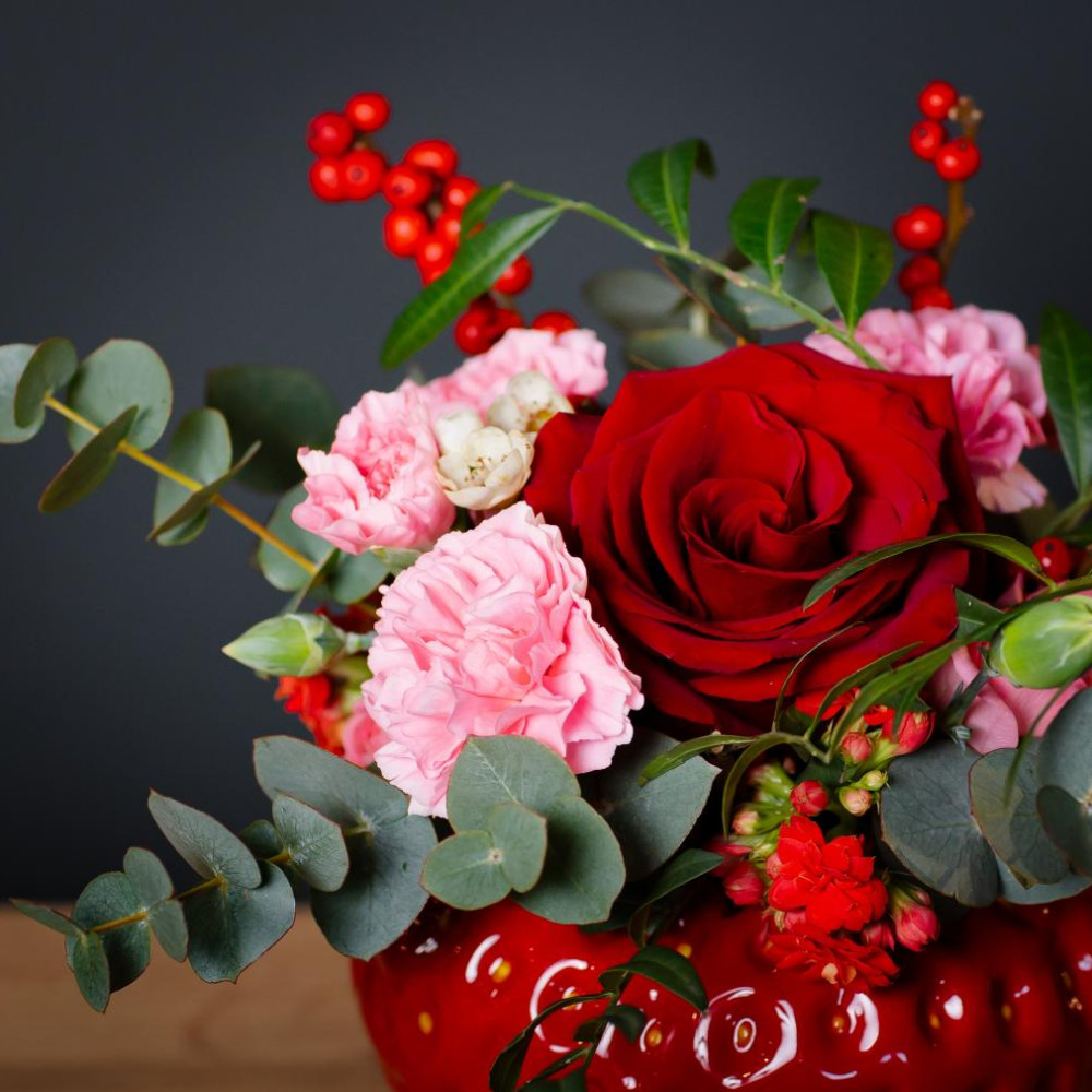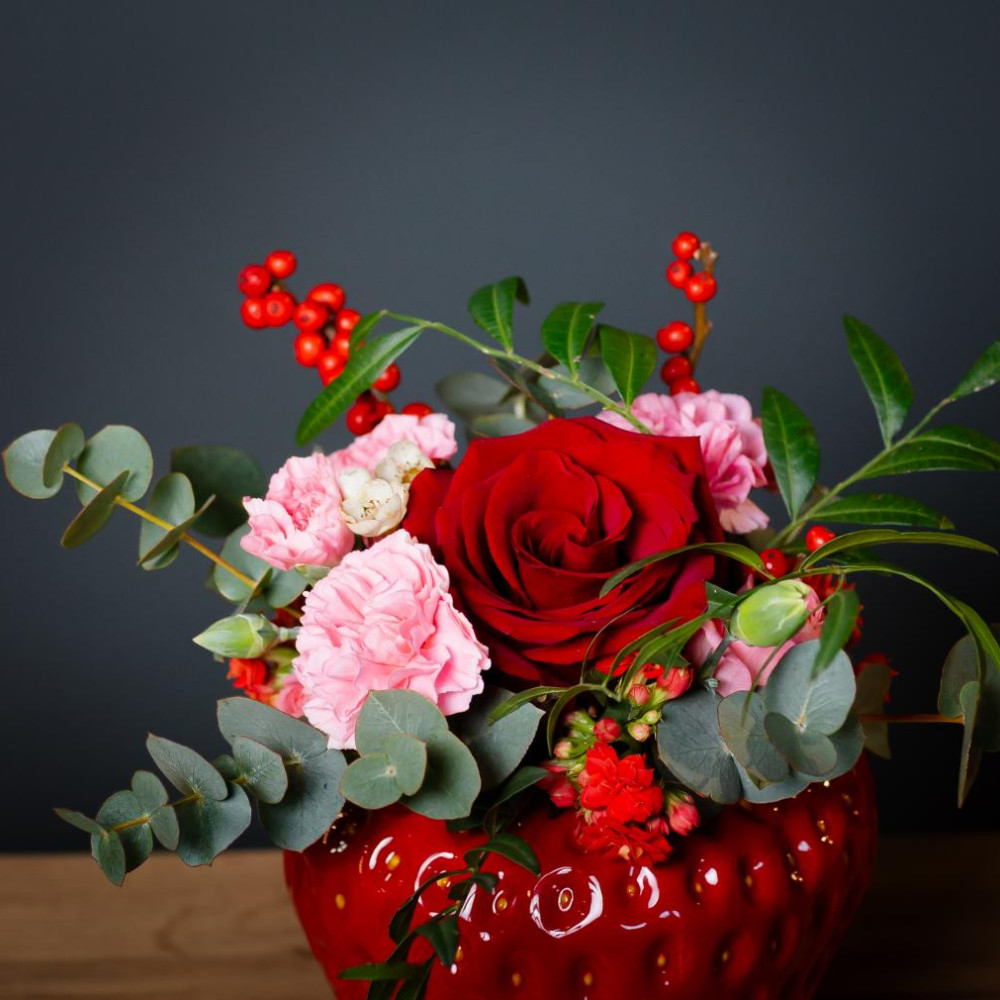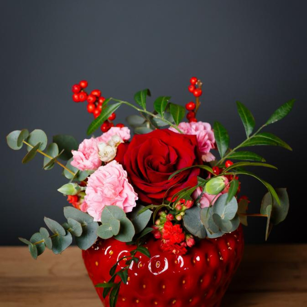 Сочный акцент для самого сладкого праздника! Композиция в авторской керамической вазе в форме спелой клубники — аппетитный декор и трогательный комплимент в одном сердце. Нежные розы и воздушные диантусы дополнены красными ягодами и свежей зеленью эвкалипта. Ваза остается у получателя как самостоятельный предмет интерьера. Готовый подарок без упаковки.
