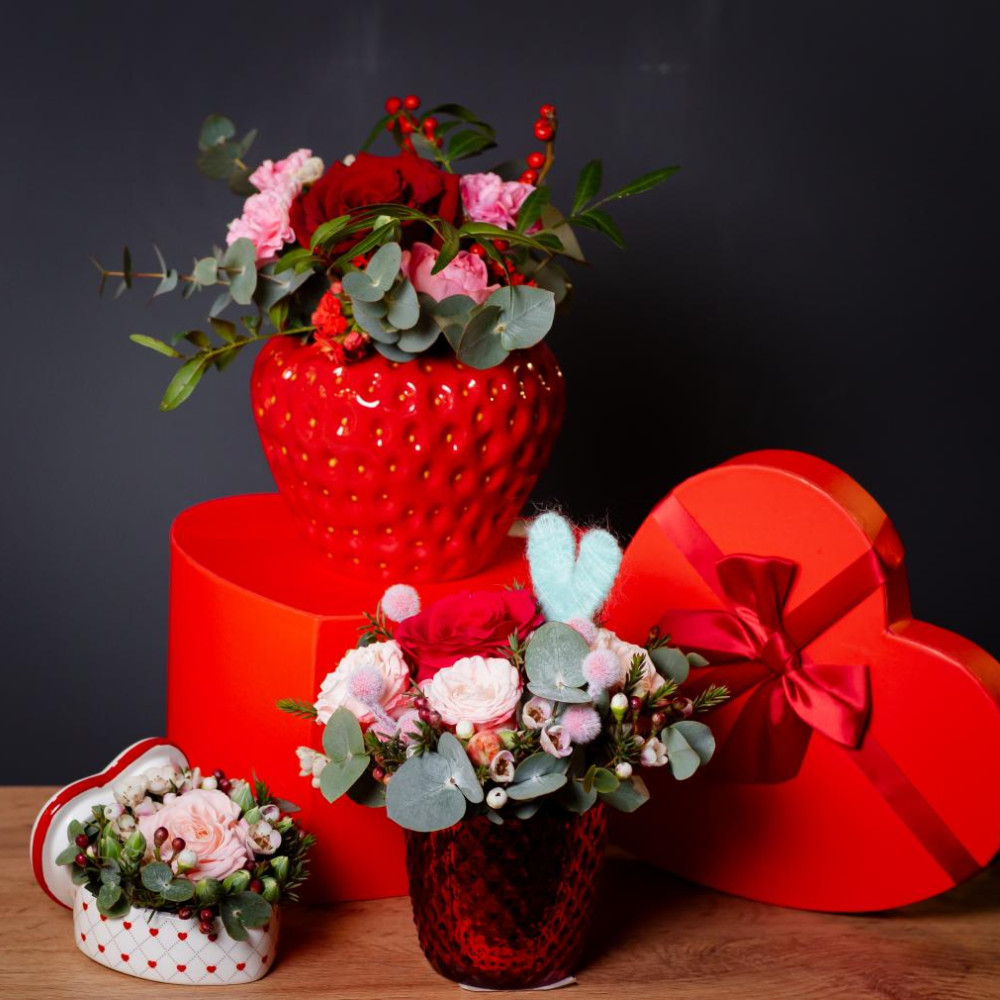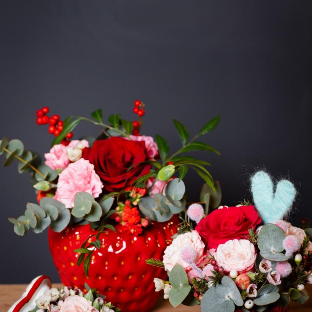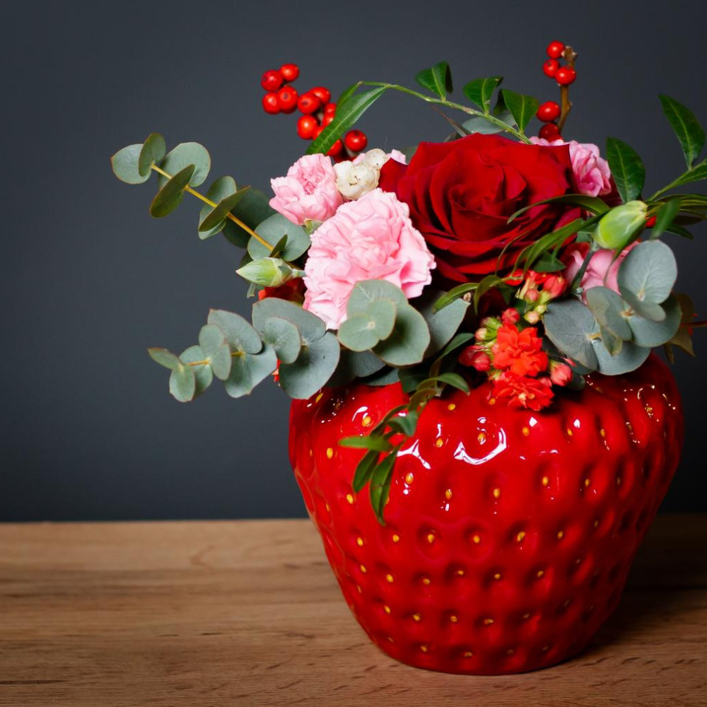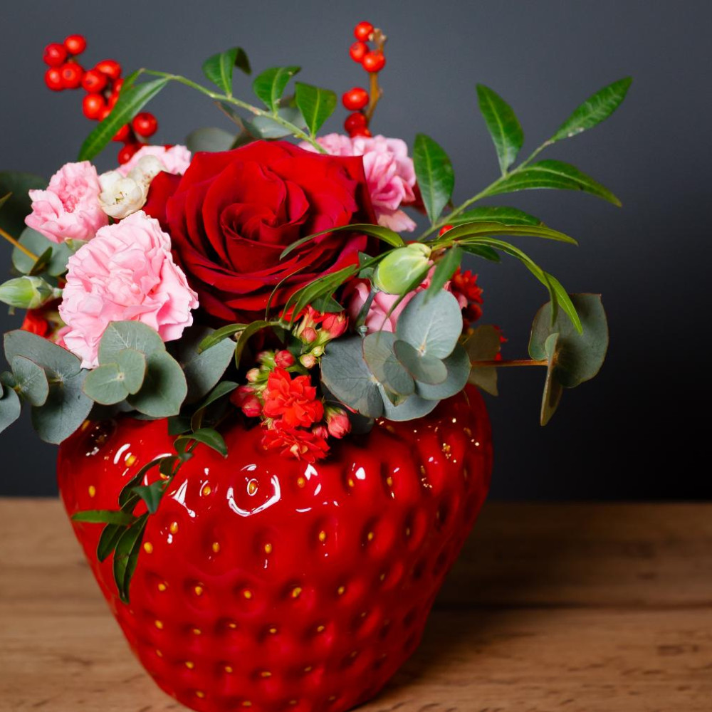 Сочный акцент для самого сладкого праздника! Композиция в авторской керамической вазе в форме спелой клубники — аппетитный декор и трогательный комплимент в одном сердце. Нежные розы и воздушные диантусы дополнены красными ягодами и свежей зеленью эвкалипта. Ваза остается у получателя как самостоятельный предмет интерьера. Готовый подарок без упаковки.